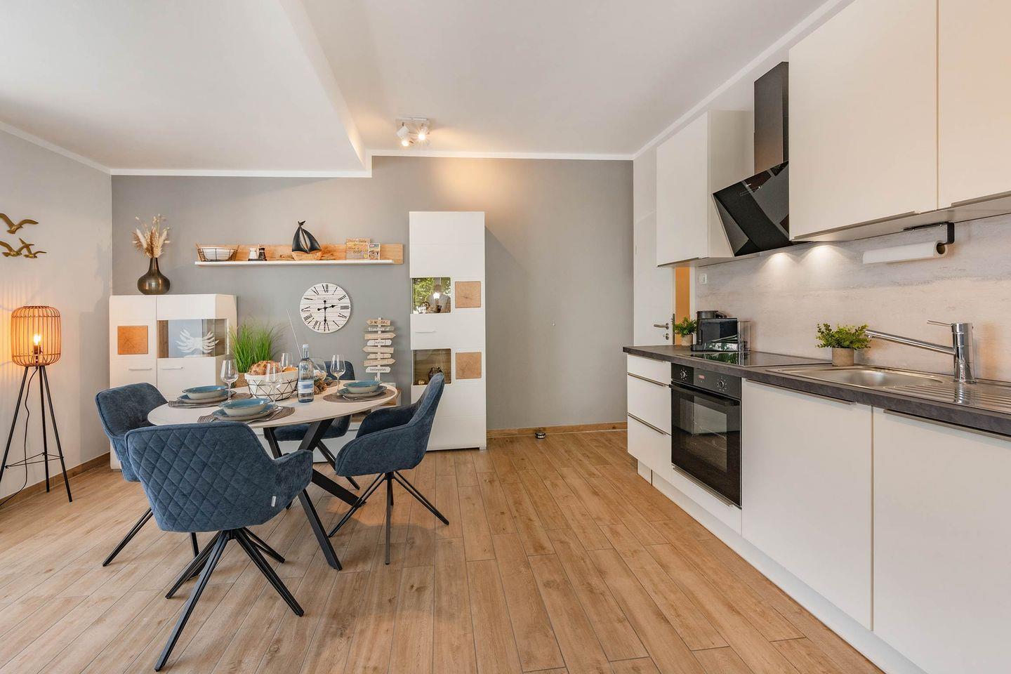 Auf großzügigen 50 Quadratmetern erwartet Sie ein offener und einladender Wohnbereich, der zum Entspannen und Wohlfühlen einlädt. Die moderne Küche ist direkt ins Wohnzimmer integriert und lässt keine Wünsche offen. Ausgestattet mit einem Backofen, einer Spülmaschine, einem Induktionsfeld und einer Mikrowelle, können Sie hier mühelos köstliche Mahlzeiten zubereiten. Genießen Sie Ihr Frühstück oder andere Speisen am stilvollen Esstisch, oder entspannen Sie auf dem gemütlichen Balkon mit südöstlicher Ausrichtung, der vom Wohnzimmer aus zugänglich ist und mit bequemer Bestuhlung zum Verweilen einlädt. Für Unterhaltung sorgt ein 43-Zoll-Flat-TV, auf dem Sie dank Amazon Prime und Netflix (mit eigenem Account) Ihre Lieblingsfilme und - Serien streamen können.