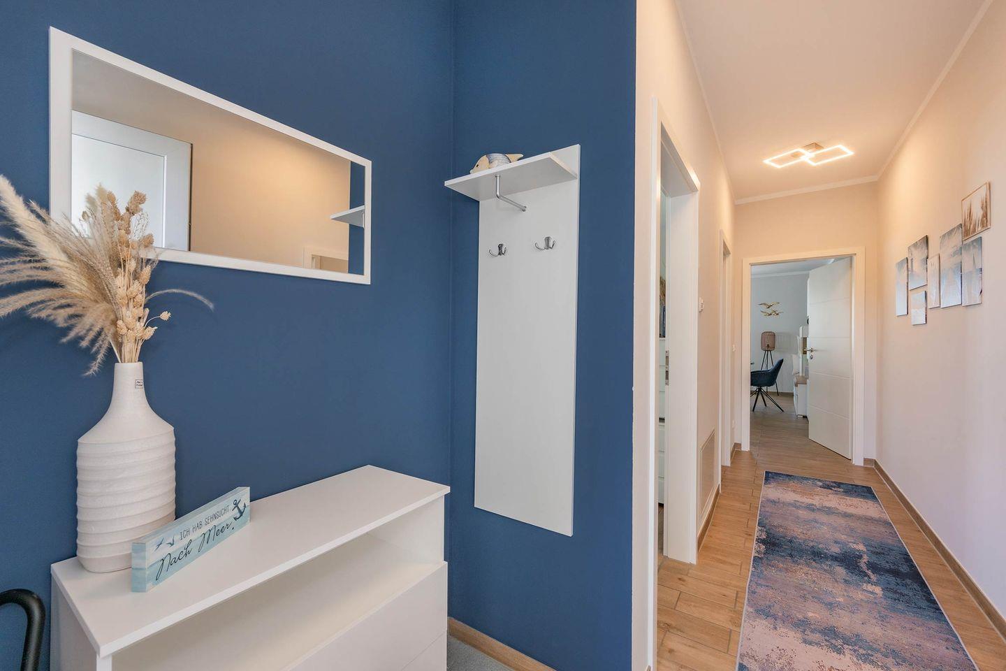 Die Einrichtung der Ferienwohnung zeichnet sich durch hochwertige Möbel und geschmackvolle Dekorationen aus, die eine behagliche und gemütliche Atmosphäre schaffen. Praktische Verdunklungsmöglichkeiten im gesamten Wohnbereich sorgen für erholsame Nächte. Für zusätzlichen Schlafkomfort bietet das Wohnzimmer eine komfortable Schlafcouch mit Matratze und Lattenrost (Liegefläche 1,60 x 2,00 Meter), die sich ideal für Kinder oder zusätzliche Gäste eignet. Das separate Schlafzimmer ist eine Oase der Ruhe, ausgestattet mit einem bequemen Boxspringbett (Liegefläche 1,60m x 2,00 Meter), Verdunklung und ausreichend Stauraum in Form eines Kleiderschranks und einer Kommode.