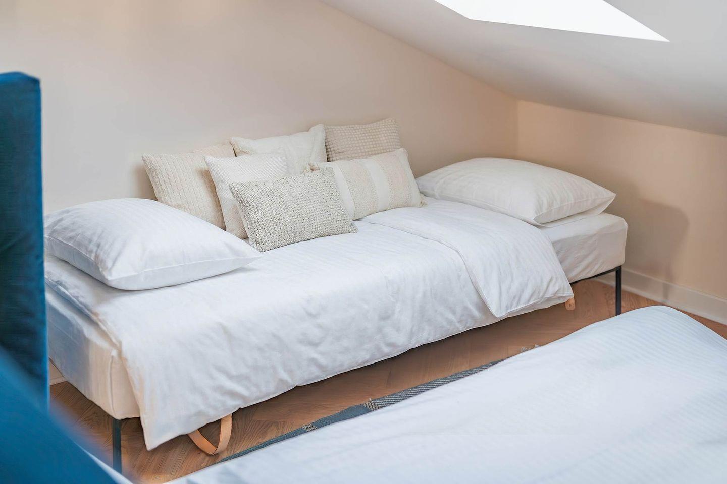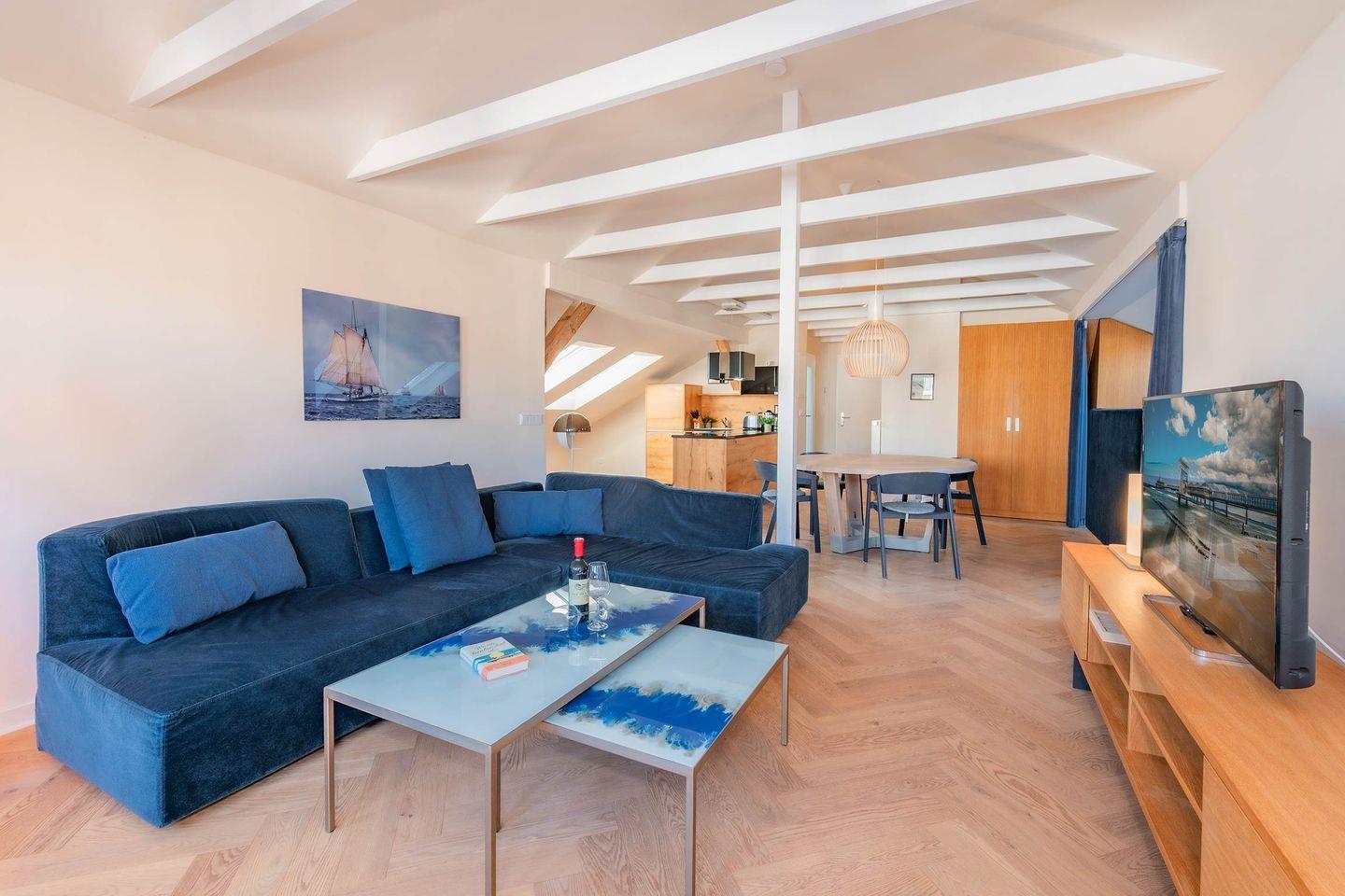 Entdecken Sie ein außergewöhnliches Wohnerlebnis im Herzen des Kaiserbades Heringsdorf in der Ferienwohnung Baltisches Haus 05. Gelegen im charmanten Dachgeschoss, der zweiten Etage des aufwendig modernisierten Gebäudes, bietet Ihnen dieses Domizil auf rund 69 m² einen Rückzugsort mit echtem Loft-Charakter. Die zentrale Lage ist ideal: Nach nur 600 Metern erreichen Sie den feinsandigen Ostseestrand und die berühmte Seebrücke, sodass Sie das maritime Flair Usedoms jederzeit genießen können. Das Besondere dieser Wohnung ist ihr offenes Raumkonzept, das Wohnen, Kochen und Schlafen fließend miteinander verbindet. Helle, sichtbare Holzbalken treffen hier auf eine stilvolle, etwas dunklere und kühlere Farbgebung, was in Kombination mit dem reichlichen Tageslicht durch die vielen Dachfenster ein einzigartiges, modernes und zugleich behagliches Ambiente schafft.