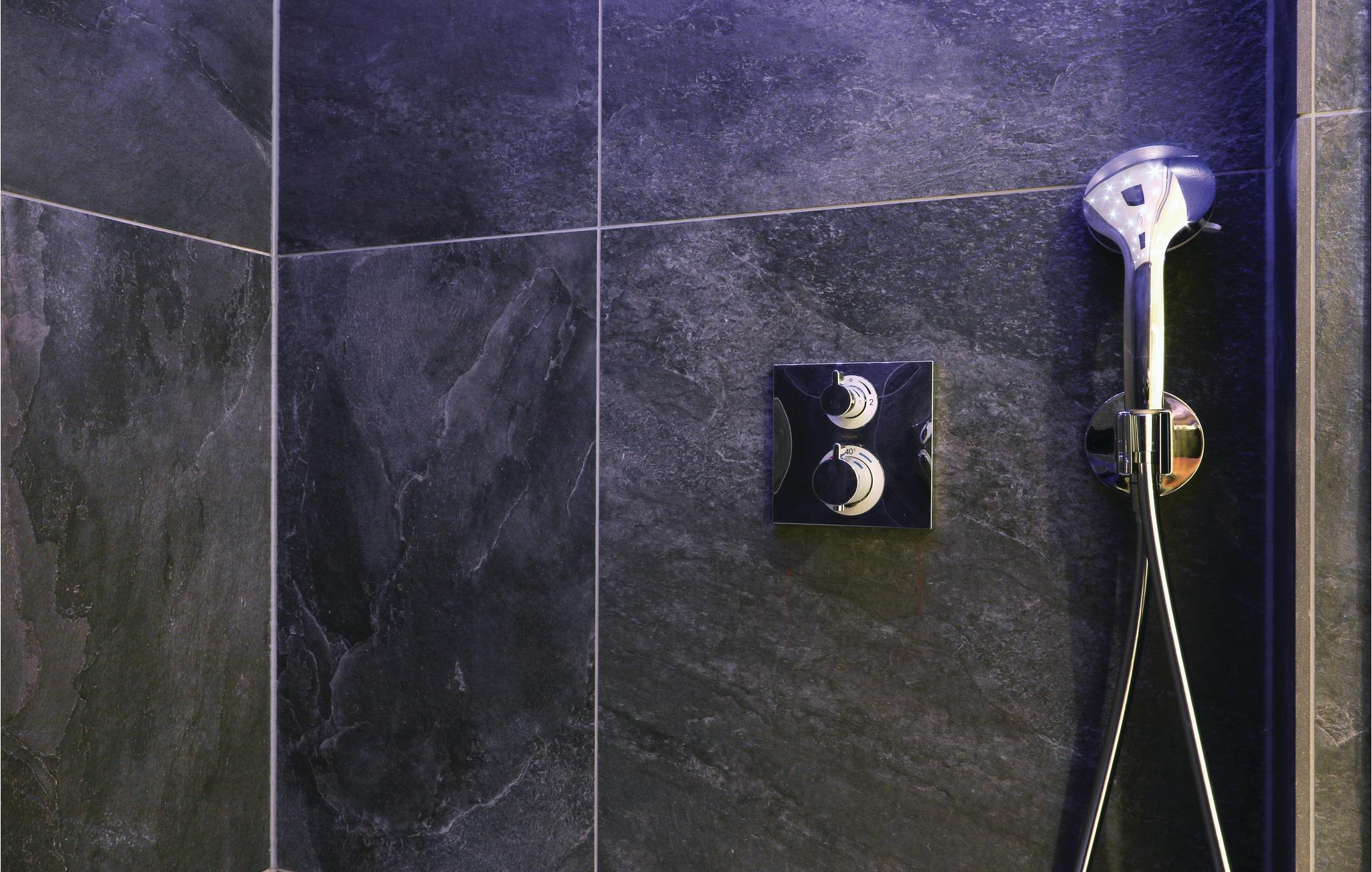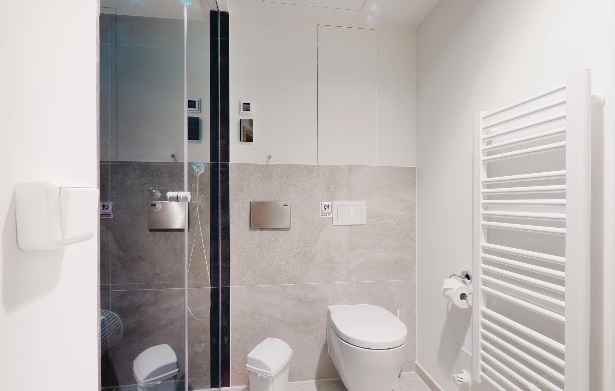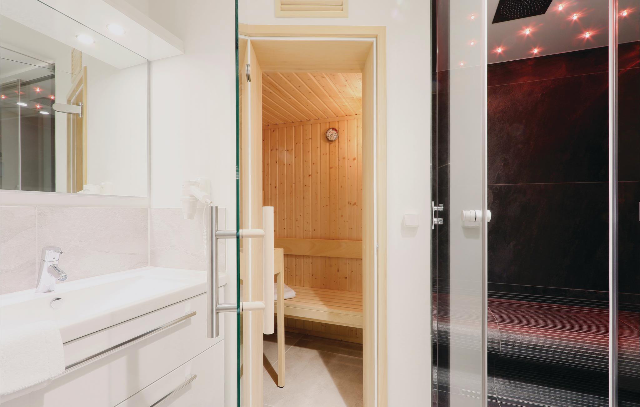 Badeværelset er et privat wellness anlæg. Her kan I nyde at sidde i saunaen efter en lang tur langs vandet. Desuden er der et dampbad med regnvandsbruser.