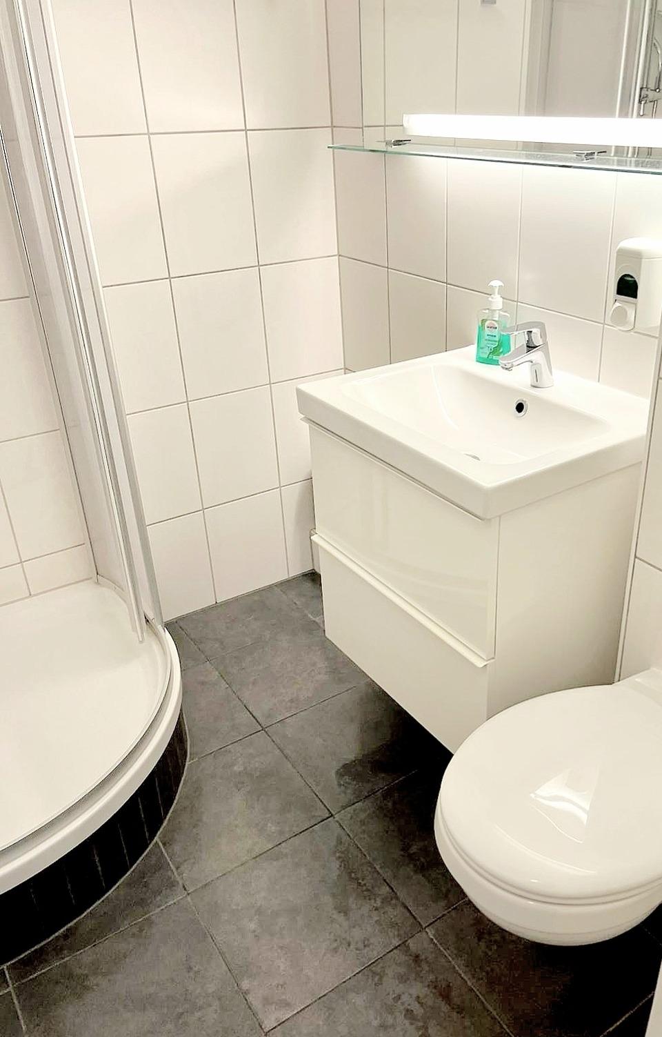 Das moderne Duschbad ist hell und freundlich gestaltet.