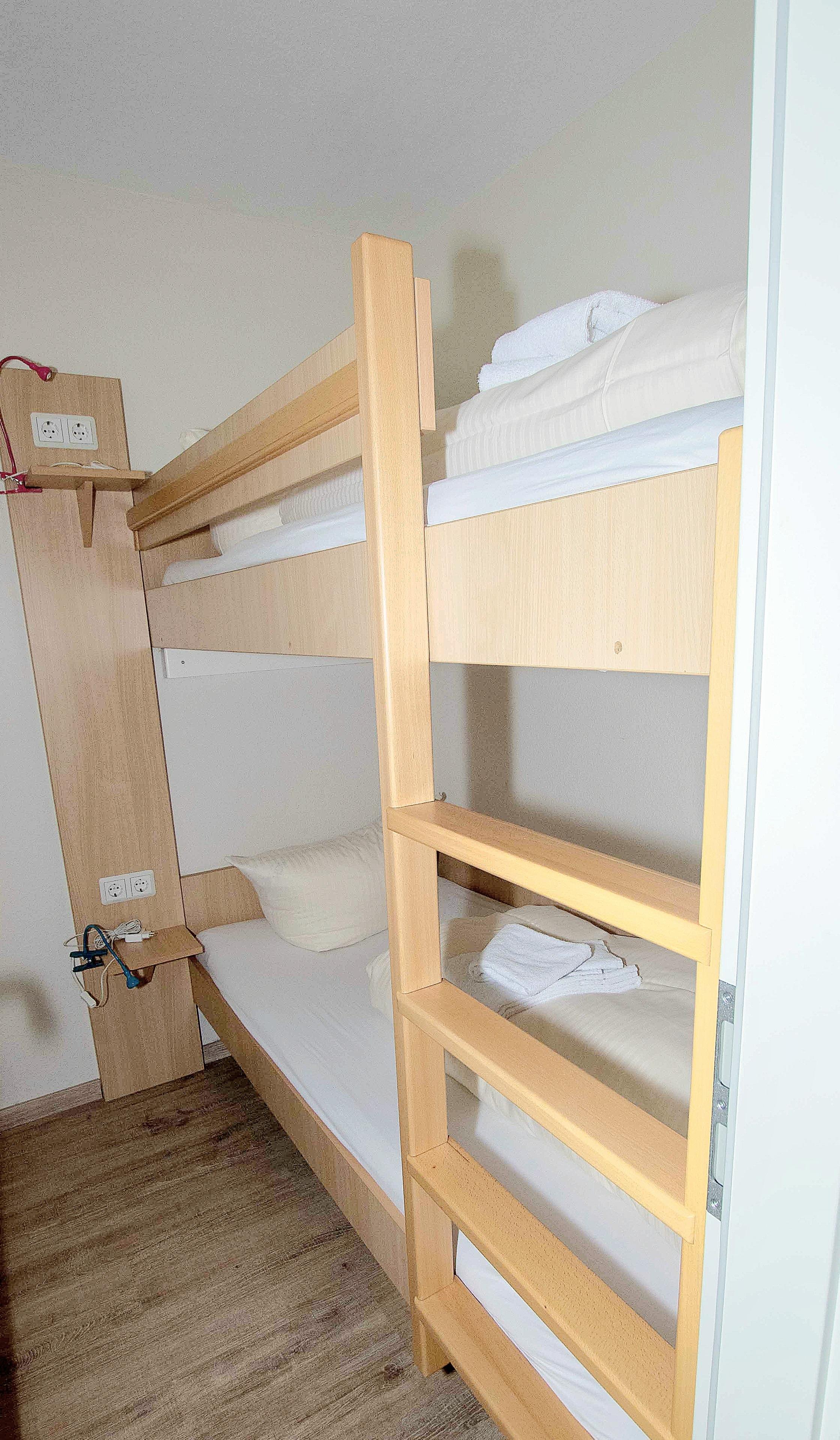 Das zweite, kleine Schlafzimmer verfügt über zwei Etagenbetten (90x200cm), die auch für Erwachsene geeignet sind. Wenn ihr mit Kindern reist, entfällt somit die abendliche Vorbereitung der Schlafcouch, und ihr könnt den Abend entspannt genießen, während die Kinder bereits schlafen.