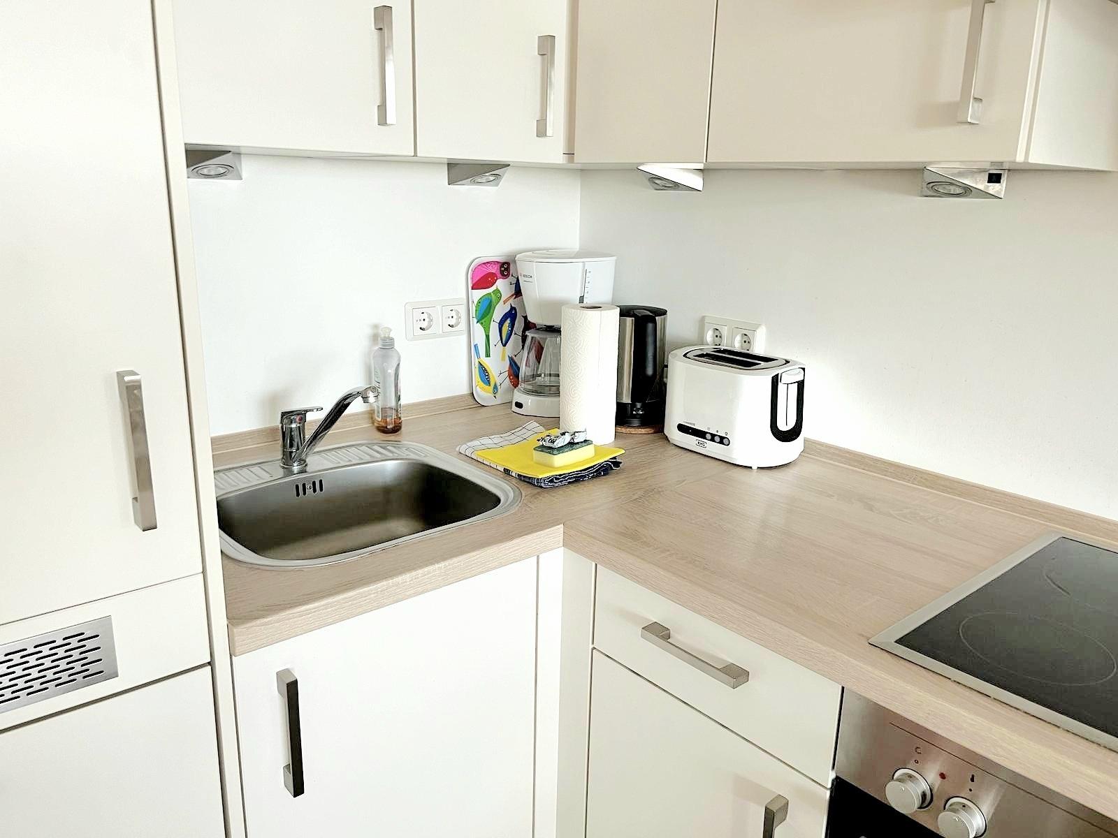 Die offene Wohnküche ist komplett ausgestattet mit Herd, Backofen, Kühlschrank und Geschirrspüler.