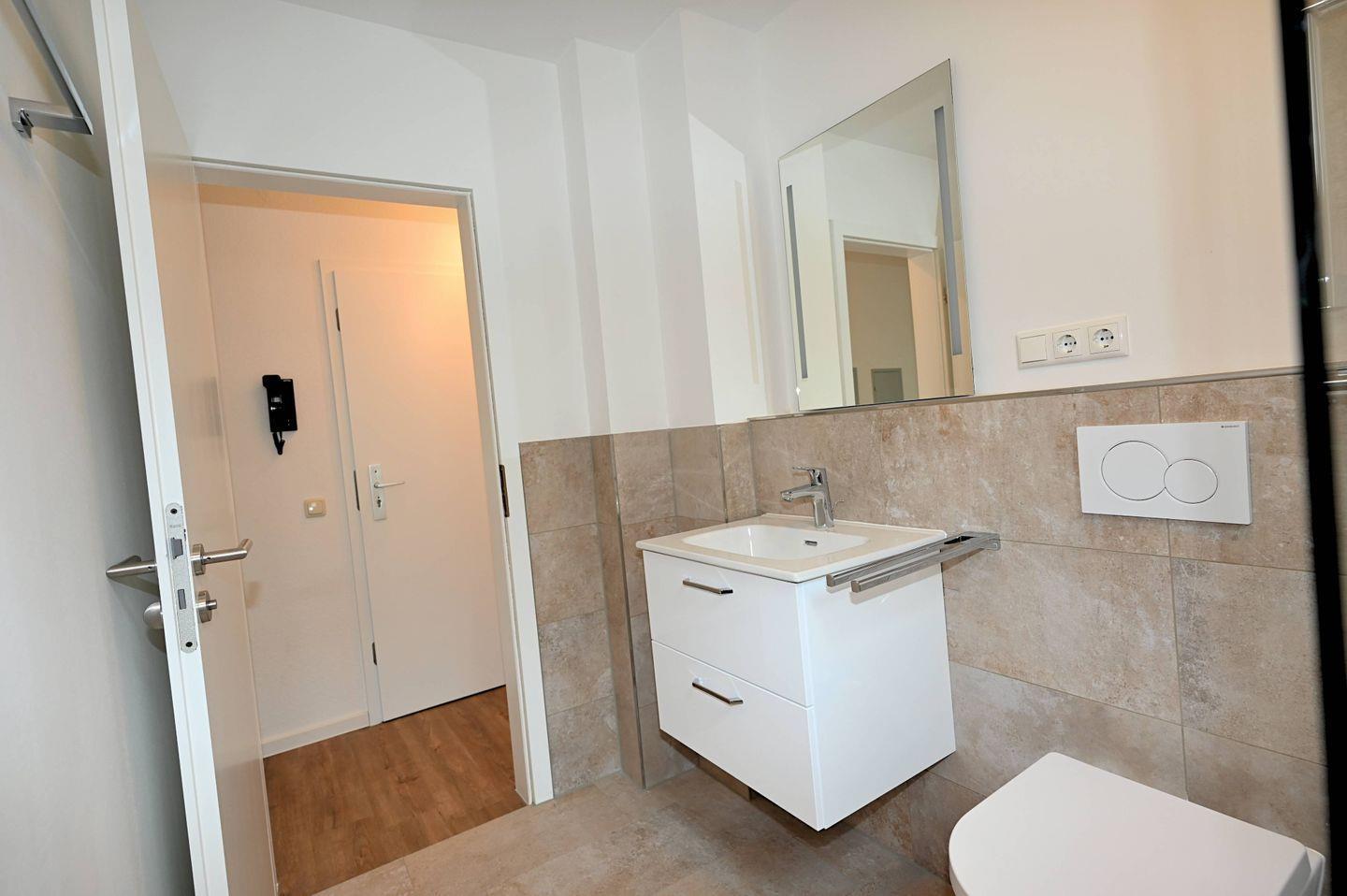 Das moderne Badezimmer bietet Ihnen eine ebenerdige Regendusche, WC, großen Spiegel, Föhn und ein Veluxfenster, das Tageslicht in den Raum lässt. Die großzügigen Schubladen unter dem Waschbecken bieten viel Stauraum für Kosmetik- und Pflegeprodukte.