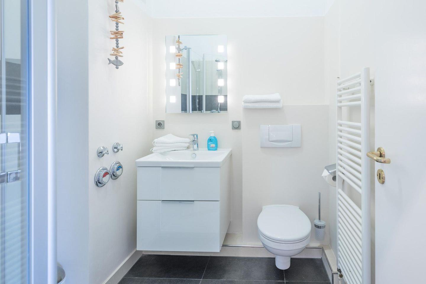 Die Studio-Wohnung ist modern eingerichtet: Ein Schlafzimmer mit einem Doppelbett (180 x 200) und eine offene und gut ausgestattete Einbauküche mit 4-Platten-Herd, Backofen, Geschirrspülmaschine, Kaffeemaschine (Filtergröße 4). Der Wohnbereich verfügt über ein bequemes Sofa, einen Flachbild-TV und einen Essbereich. Das moderne Badezimmer ist mit einer Dusche, WC und Waschbecken eingerichtet. Vom kleinen Balkon aus können Sie mit Blick auf den Hafen den Tag gemütlich ausklingen lassen.