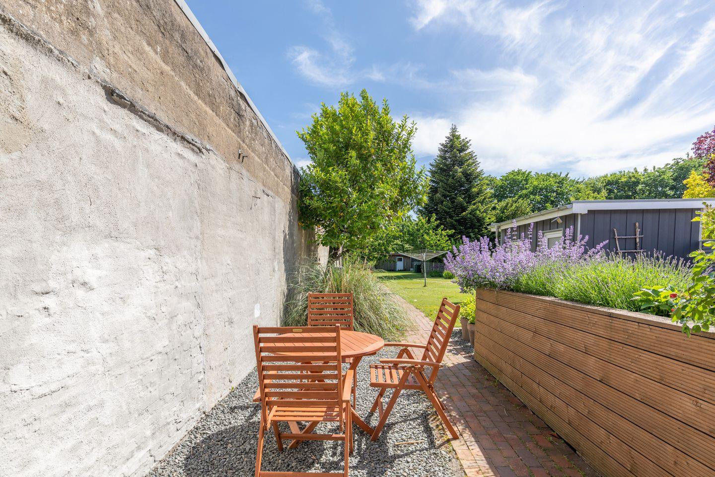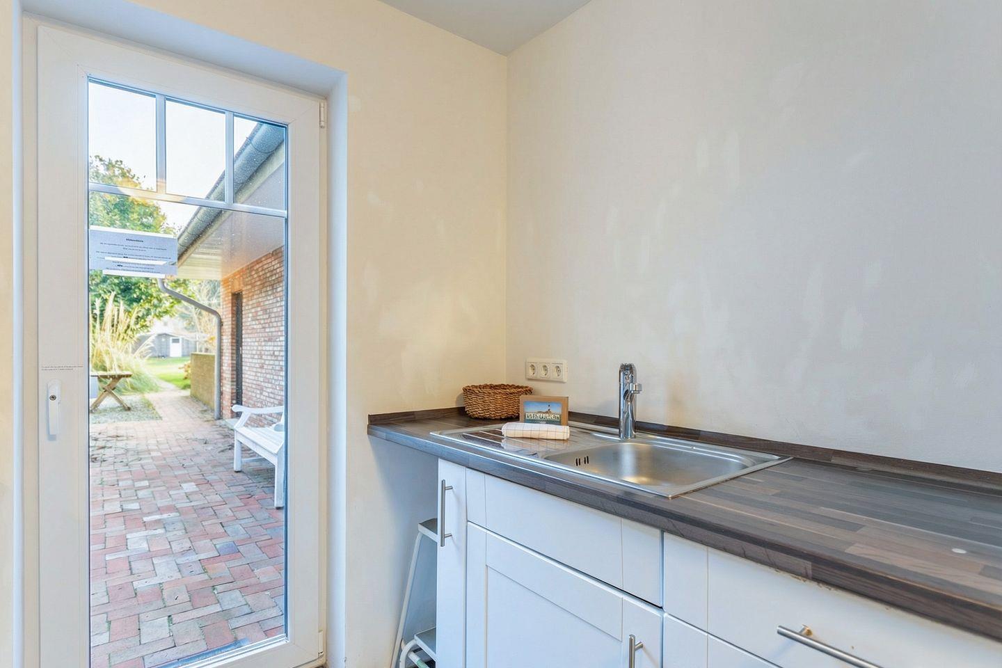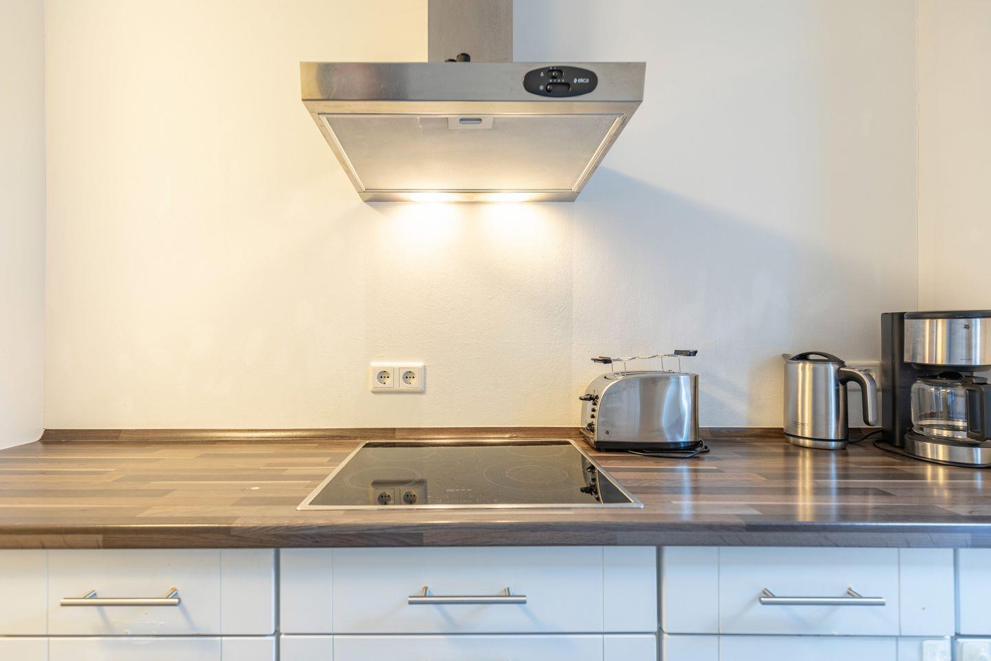 Die separate Küche bietet Ihnen Geschirrspüler, Backofen, Ceranfeld mit 4 Herdplatten, Kühlschrank mit Gefrierfach, Filterkaffeemaschine (Filtergröße 4), Wasserkocher und Toaster. Von hier aus haben Sie Zugang zur Terrasse und zum gemeinschaftlichen Garten mit Gartenmöbeln.