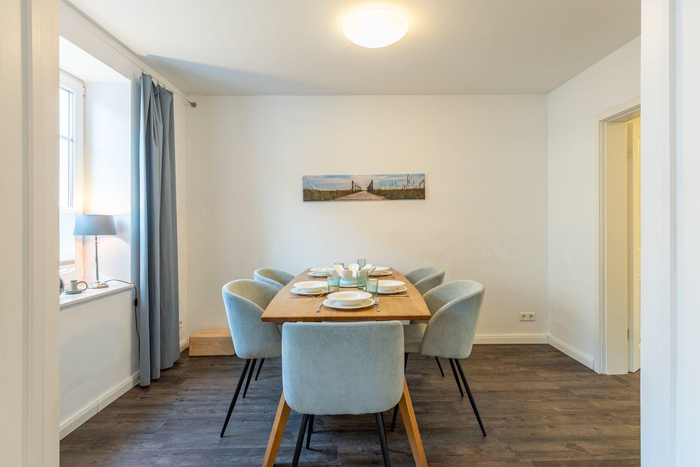 Der Wohnbereich ist mit einem Sofa und einem Flachbildschirm-TV ausgestattet. Der große Esstisch lädt Sie ein zu geselligen Runden in schöner Atmosphäre.