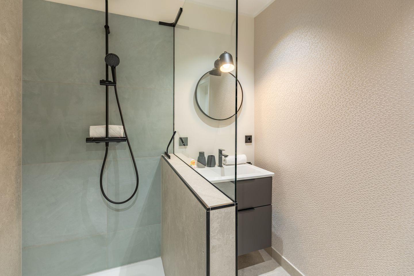 Das Badezimmer ist modern ausgestattet und in hellen, zeitlosen Farben gehalten. Hochwertige Fliesen, eine strukturierte Wandgestaltung und schwarze Akzente bei Armaturen und Accessoires verleihen dem Raum ein stimmiges und klares Erscheinungsbild. Die großzügige Dusche ist mit einer Regenbrause und zusätzlicher Handbrause ausgestattet und durch eine Glasabtrennung elegant vom restlichen Bereich getrennt. Ein Handtuchheizkörper rundet die funktionale Ausstattung ab. In einem separaten und gleich hochwertig gestalteten Raum, befindet sich, getrennt vom Badezimmer, die Toilette mit Waschbecken.
