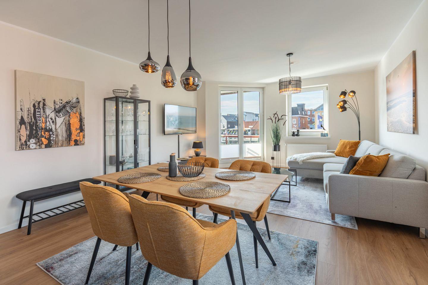 Die Wohnung liegt im 1. Obergeschoss, wurde im Juli 2025 vollständig saniert und neu eingerichtet und bietet auf rund 80 Quadratmetern ausreichend Platz für bis zu vier Personen. Der offene Wohn-, Ess- und Küchenbereich bildet das Herzstück der Ferienwohnung und überzeugt mit einer modernen und zugleich wohnlichen Gestaltung. Der Wohnbereich ist mit einem komfortablen Ecksofa ausgestattet, das zum Entspannen einlädt, sei es nach einem Tag an der frischen Nordseeluft oder für einen gemütlichen Abend mit einem Buch oder Film. Große Fenster lassen viel Tageslicht herein und schaffen eine freundliche Atmosphäre. Direkt angrenzend befindet sich der Essplatz mit einem massivem Holztisch und vier bequemen Stühlen, ideal für gemeinsame Mahlzeiten oder Spieleabende. Die angrenzende Küche ist vollständig ausgestattet und fügt sich optisch stimmig in das Raumkonzept ein. Sie bietet neben einem modernen Cerankochfeld, Backofen, Kühlschrank mit Gefrierfach und Geschirrspüler auch zahlreiche Kleingeräte wie Kaffeemaschine, Wasserkocher, Toaster und Mikrowelle. Ausreichend Arbeitsfläche und Stauraum sind ebenfalls vorhanden.