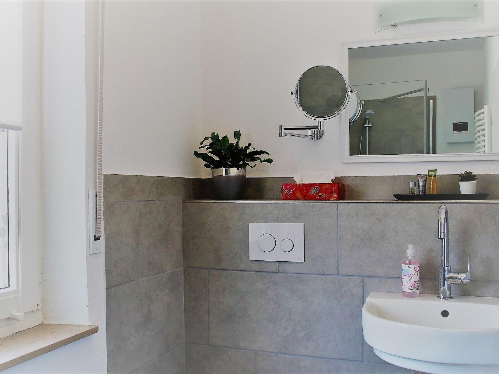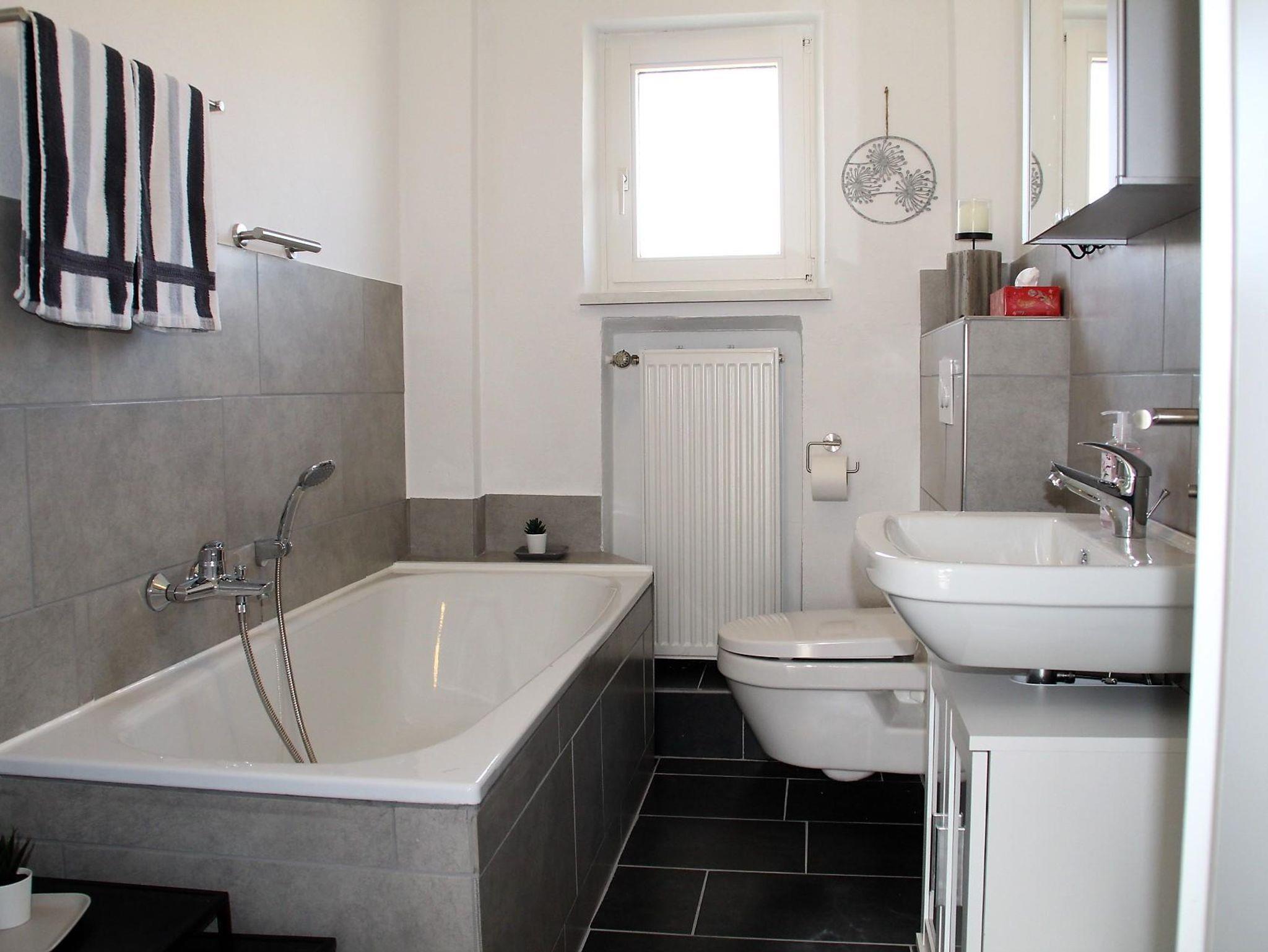 Es gibt zwei Badezimmer. Eins mit Dusche und WC, das zweite mit Badewanne und WC.