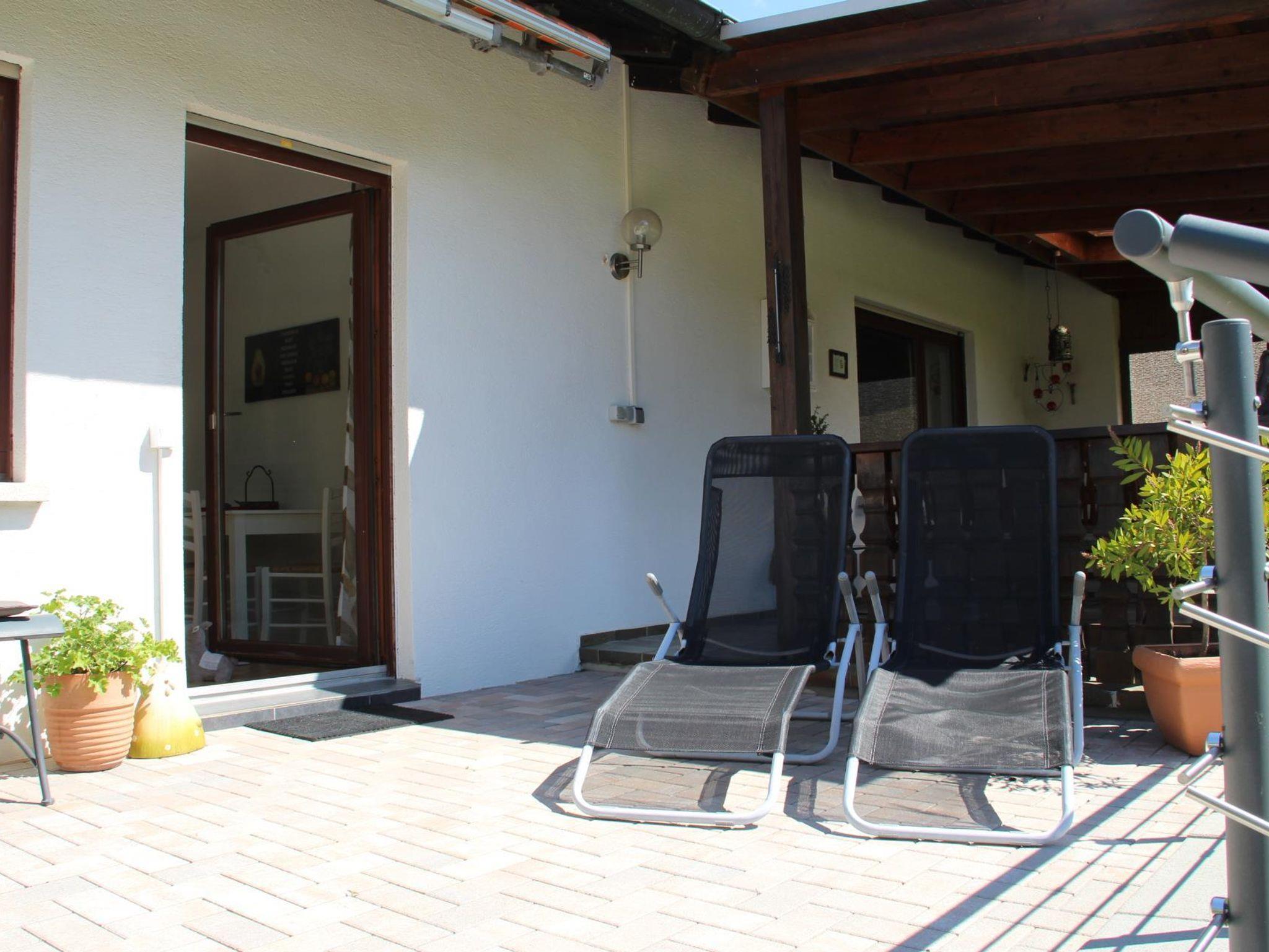 Die Terrasse ist zum großen Teil überdacht, mit einer komfortablen Sitzgruppe für 8-10 Personen. Auf der Sonnenseite der Terrasse stehen Liegen zur Verfügung.