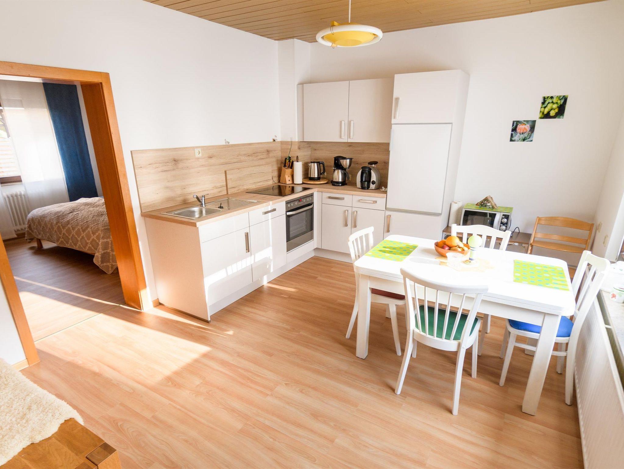 Die Wohnküche ist mit Spülmaschine, Kühlschrank mit Gefrierfach, Wasserkocher,