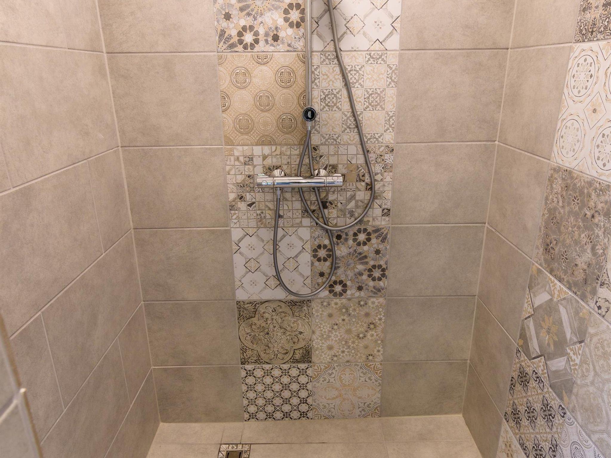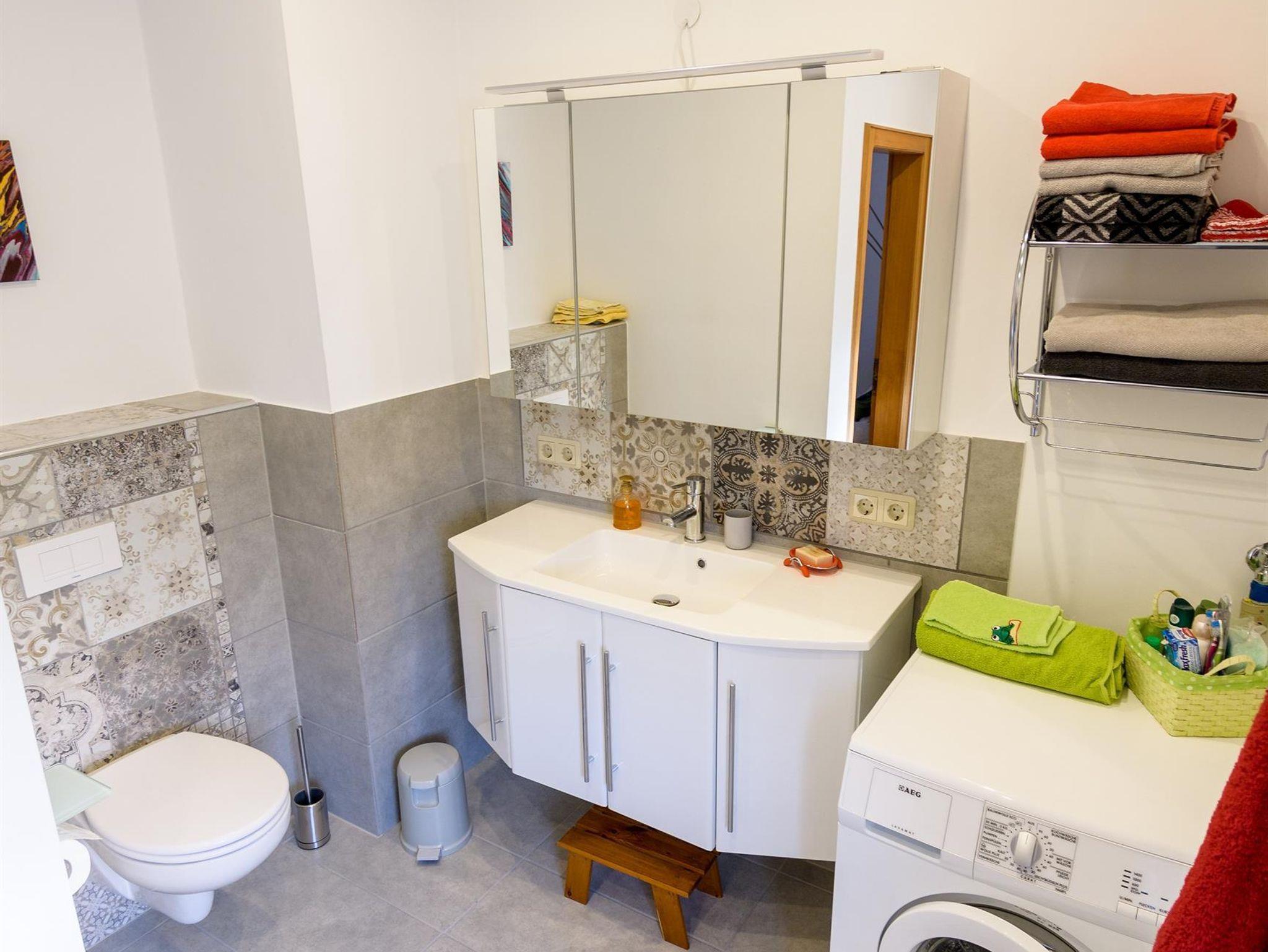 Das Badezimmer besticht durch seine große Dusche. Eine Waschmaschine sowie ein Föhn sind
