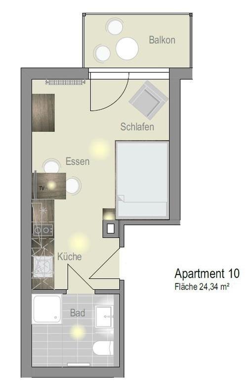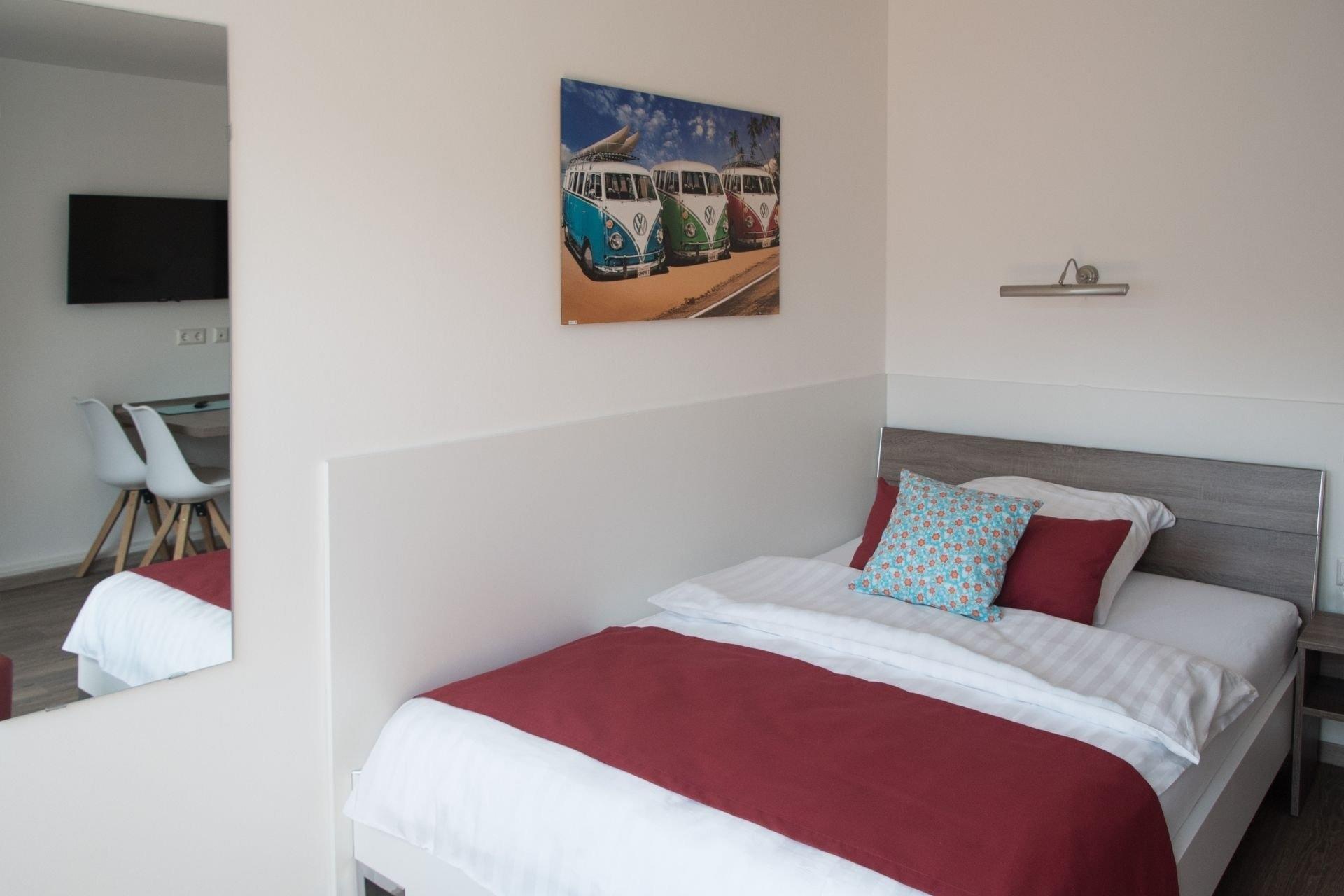 Das 24 m² große Apartment mit einem 1,40 m breiten franz. Doppelbett befindet sich in der 2. Etage. Ein Balkon ist vorhanden. Dieses Apartment bietet Platz für 2 Personen.