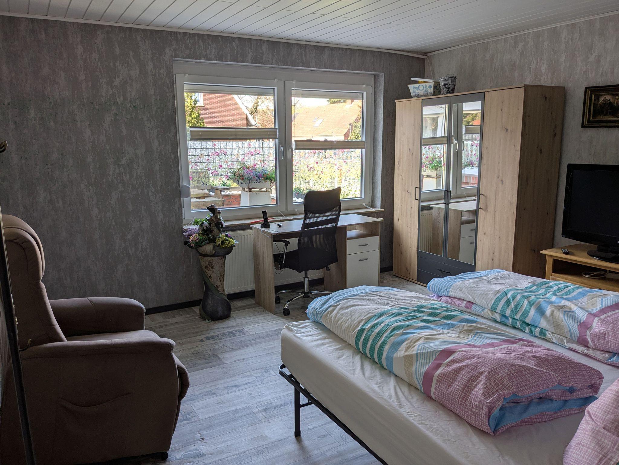 Die FeWo ist ca. 95qm groß und funktionell eingerichtet. Haustiere, vor allem Hunde, sind herzlich Wllkommen. Die komplett ausgestattete Küche geht nahtlos in das Esszimmer mit 2,80 m Esstisch und dann offen in das Wohnzimmer über. Von dort geht es durch den ehemaligen HWR in das Schlafzimmer mit Doppelbett. Gegenüber dem Schlafzimmer befindet sich ein neues Bad. Von dort gelangt man wieder in den Flur im Eingangsbereich. Ein weiteres Schlafzimmer wäre im 1. OG - müsste aber extra gebucht werden. Große, neuwertig ausgestattete Ferienwohnung mit 2 Terrassen und gr.eingezäunten Garten mit Felder im Anschluss