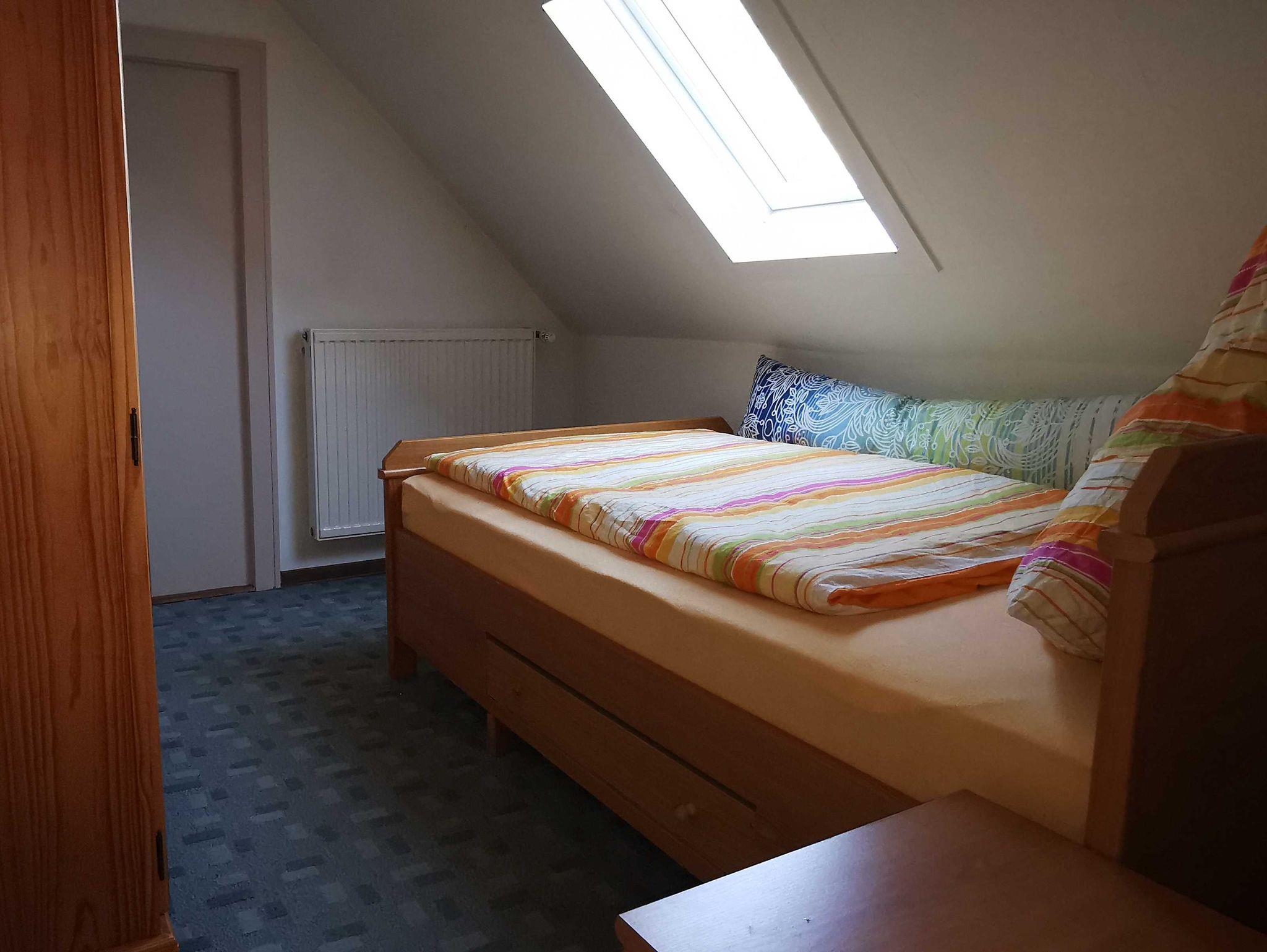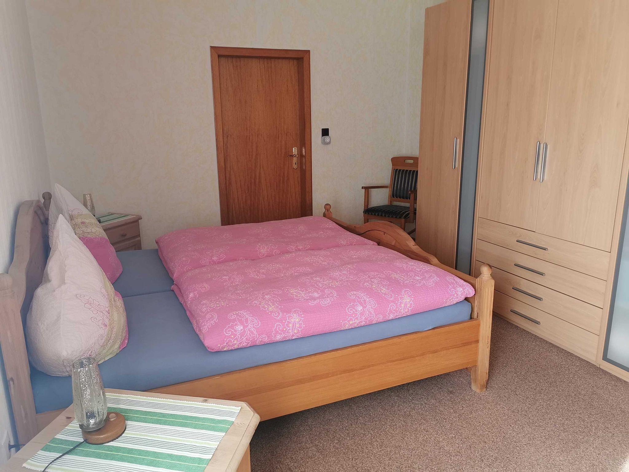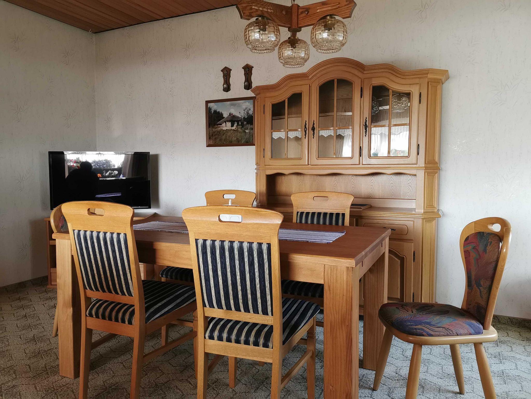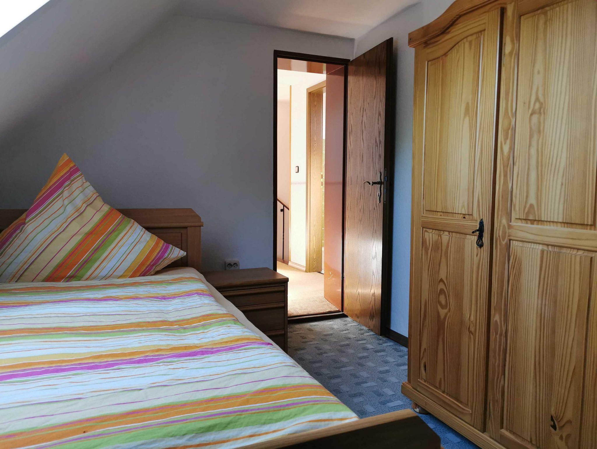 Das ca. 90 qm große Ferienhaus (Anbau) befindet sich im Erd- und Obergeschoss. Durch den separaten Eingang betreten Sie den Vorflur mit Garderobe. Links befindet sich das Schlafzimmer 1 mit Doppelbett (180x200 cm) und Kleiderschrank, geradeaus ist das WC. Weiter links befindet sich die vollausgestattete Küche u.a. mit Cerankochfeld, Backofen, Mikrowelle, Kaffeemaschine, Wasserkocher und Toaster mit Essecke und Terrassenzugang auf die überdachte Ostterrasse mit Gartenmöbeln. Rechts vom Flur aus kommen Sie in das große Wohnzimmer mit weiterer Essecke, Ecksofa und Flachbildfernseher. Über einen Treppenaufgang im Flur erreichen Sie das Obergeschoss. Links befindet sich das separate WC und das Schlafzimmer 2 mit Einzelbett (120x200 cm) und Kleiderschrank. Vom Treppenaufgang rechts befindet sich das Badezimmer mit Dusche und Badewanne sowie Waschtisch und Waschmaschine inkl. Handtücher, das Schlafzimmer 3 mit Einzelbett (90x200 cm) und Kommode und das Schlafzimmer 4 mit Doppelbett (180x200 cm) und Kleiderschrank. In allen Schlafräumen besteht räumlich die Möglichkeit ein Kinderbett aufzustellen.
