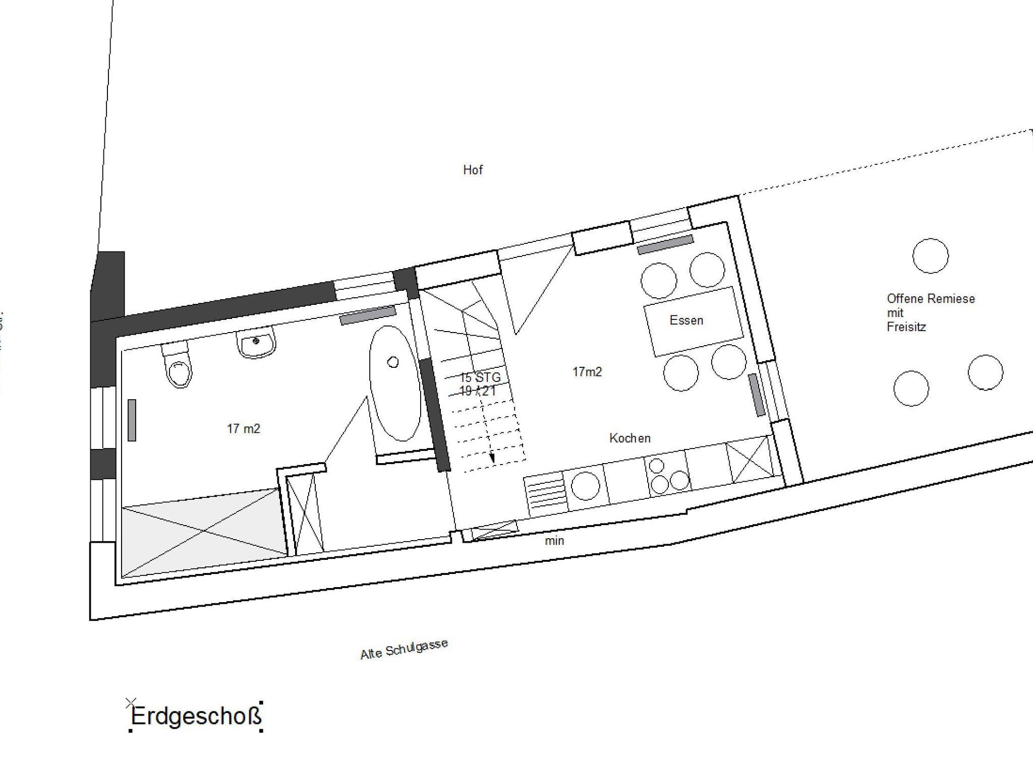 Im Eingangsbereich im EG befindet sich eine kleine Küchenzeile im Landhausstil mit vier Induktionsherdplatten, Kühlschrank mit kleinem Gefrierfach, einer Geschirrspülmaschine, Kaffeepadzubereiter, Wasserkocher und sämtlichem Kücheninventar wie Töpfen, Geschirr etc.. Eine gemütliche Sitzbank, sowie ein Esstisch und drei Stühle laden zum Verweilen ein.