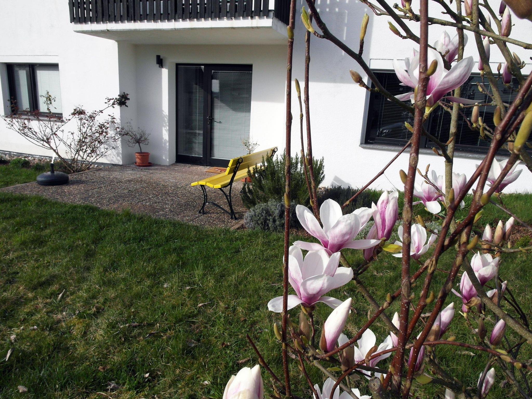Die helle Erdgeschosswohnung (70qm) befindet sich im Haus der Gastgeber. Für Fahrräder und Motorräder steht eine Garage mit Lademöglichkeit zur Verfügung, Parkplätze gibt es direkt am Haus und an der Straße, kostenloses W-Lan, große Küche mit Zugang zur eigenen Terrasse, geräumiges Wohnzimmer, Schlafzimmer mit Doppelbett, Bad mit Dusche und WC, Flur mit Garderobe