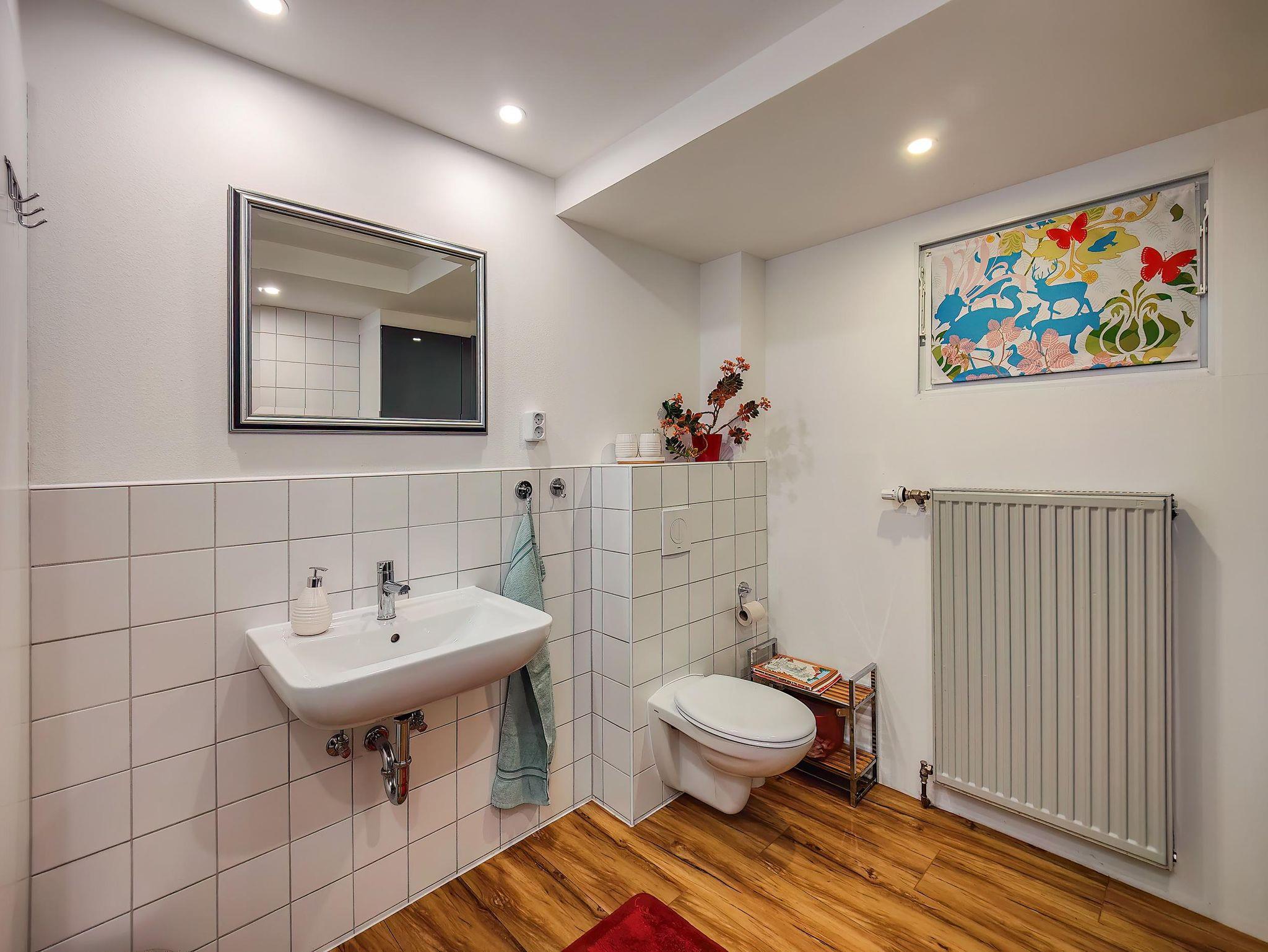 Ausstattung Bad: WC, Dusche , Waschbecken, Ganzkörperspiegel, Badetücher, Handtücher, Seife, Duschgel, Duschhauben, Föhn