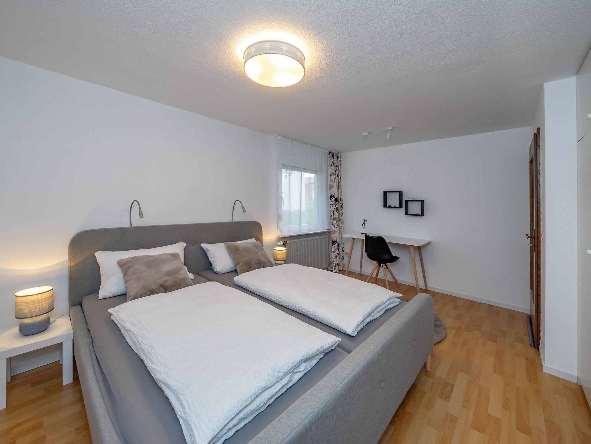 Ausstattung Schlafzimmer: Doppelbett 180×200 mit Leseleuchten, Bettwäsche (Betten bezogen), Kleiderschrank mit Safe, Schrank mit Schubladenfach, Schreibtisch, Vorhang, Rollladen