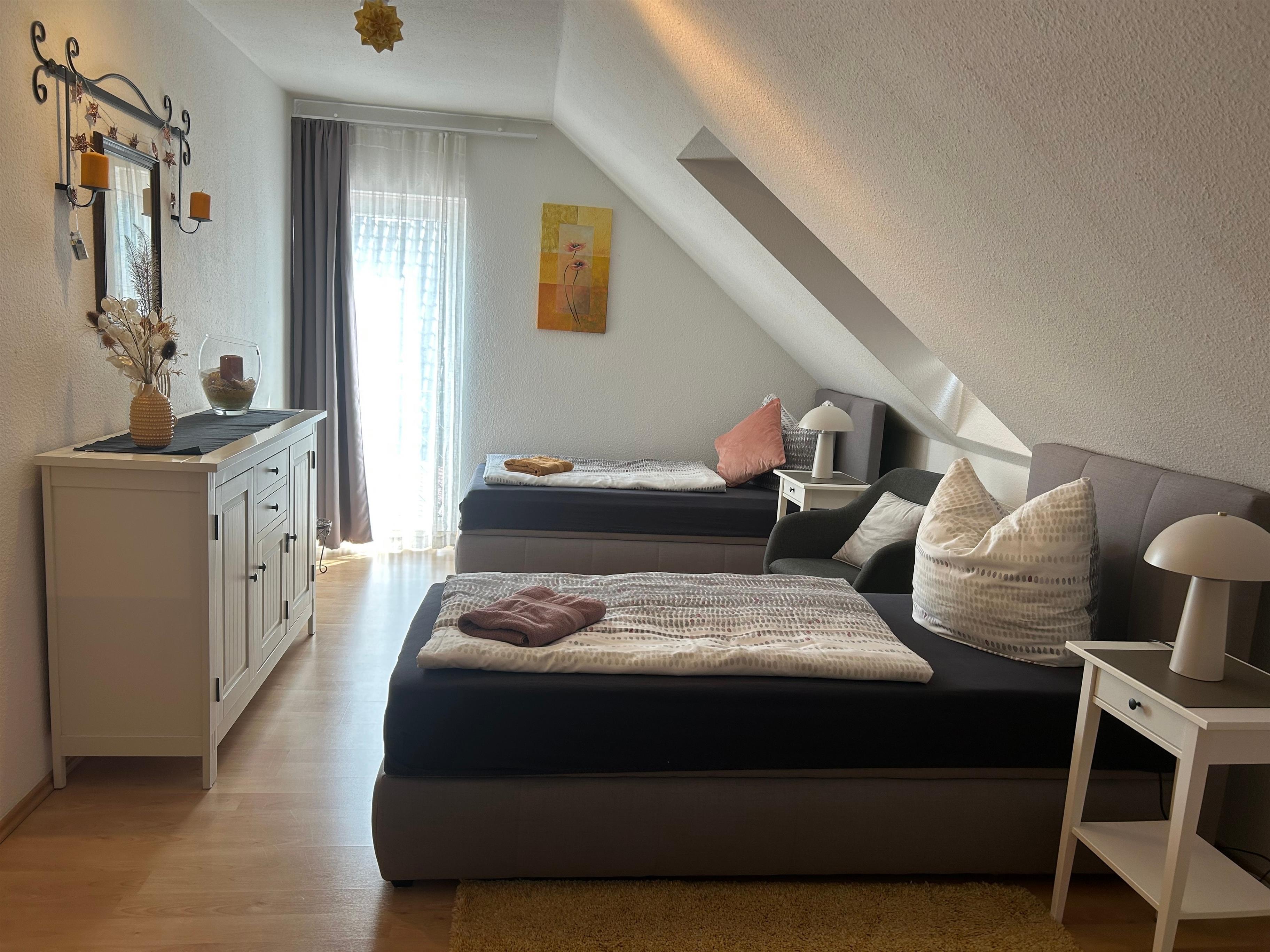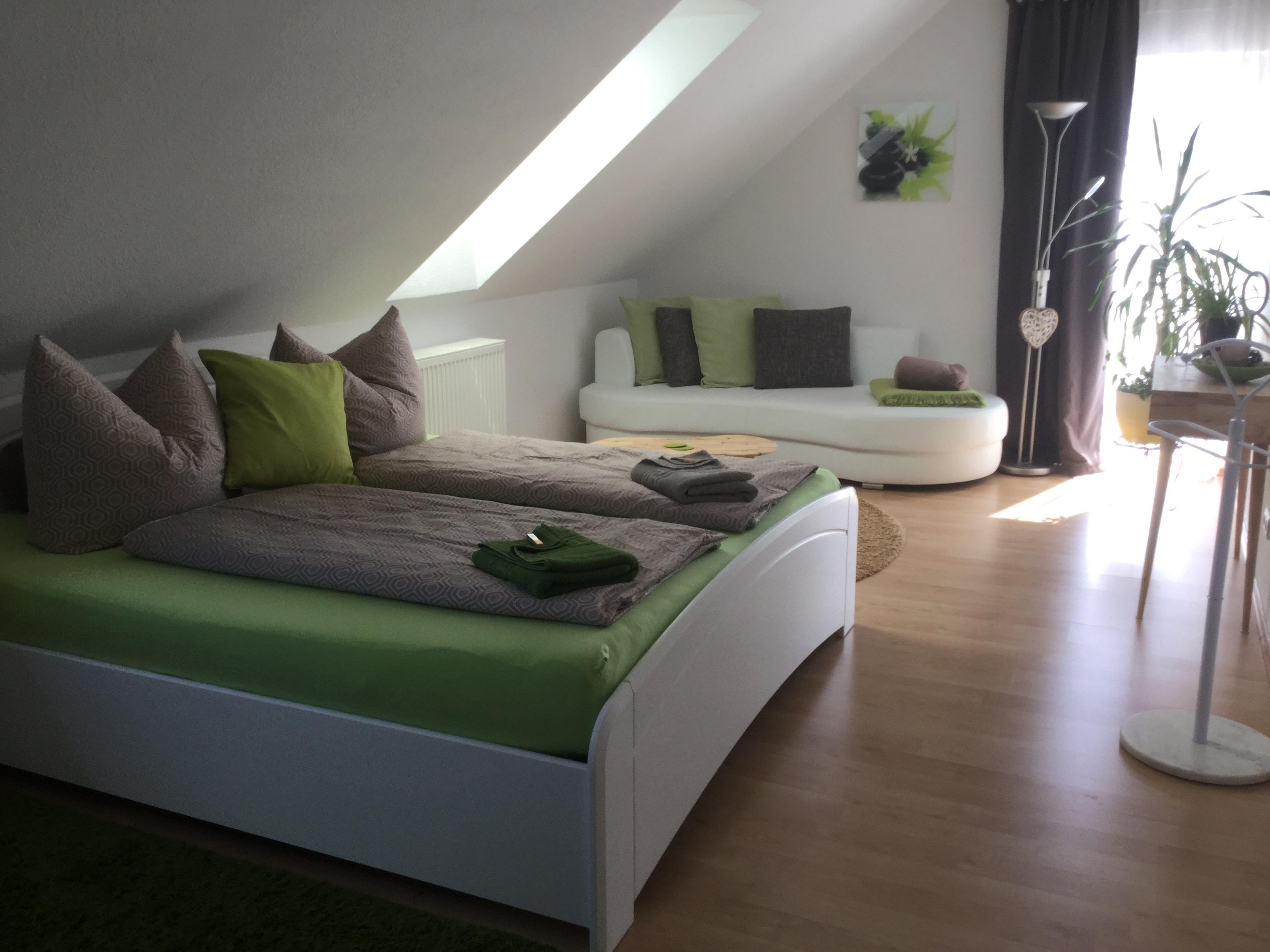 Große modern ausgestattete Nichtraucher-Wohnung mit Blick auf den Kickelhahn (Aussichtsturm und Gaststätte) und separatem Zugang. Das Haus befindet sich auf einem sonnigen Südhang in einem ruhigen Wohngebiet in Ilmenau. Die Wohnung bietet 2 Schlafzimmer,eins mit 1 Doppelbett, das Zweite mit Einzelbetten, das Wohnzimmer ist kombiniert mit Küche und Essbereich sowie mit Schlafcouch und Ein Badezimmer. Die Wohnung ist somit perfekt für Familien oder Freunde, die zusammen Urlaub machen wollen, geeignet. Kinder unter 2 Jahre sind kostenfrei