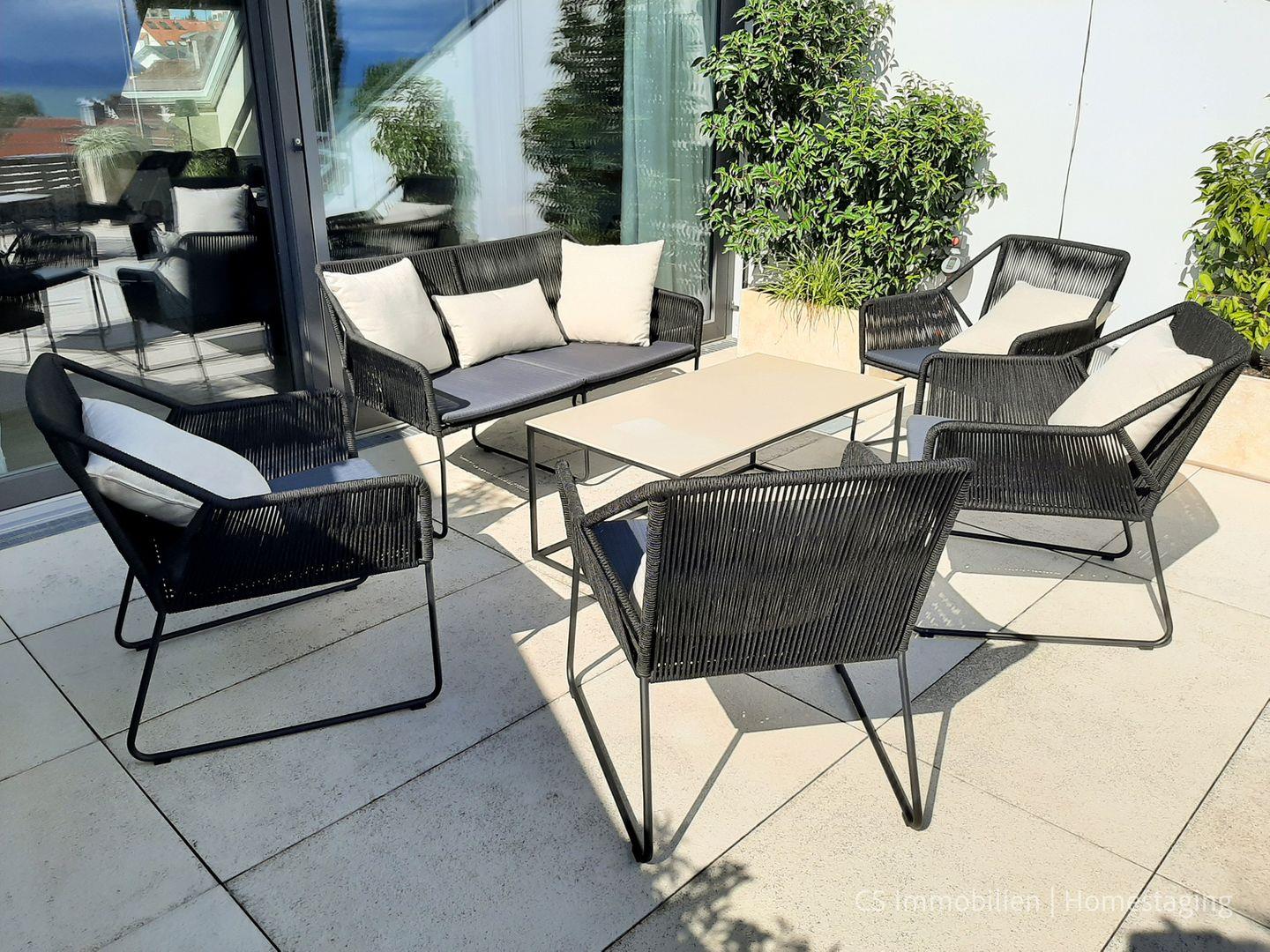 Das Highlight des Lofts ist die 39 m² große Dachterrasse. Ausgestattet mit Loungemöbeln, Sonnenliegen, einem Sonnensegel und gemütlicher Abendbeleuchtung, ist sie der perfekte Ort, um den Tag bei einem Glas Bodensee-Wein ausklingen zu lassen. Elektrisch bedienbare Fenster mit Mückenschutz und Rollläden sorgen für zusätzlichen Komfort.