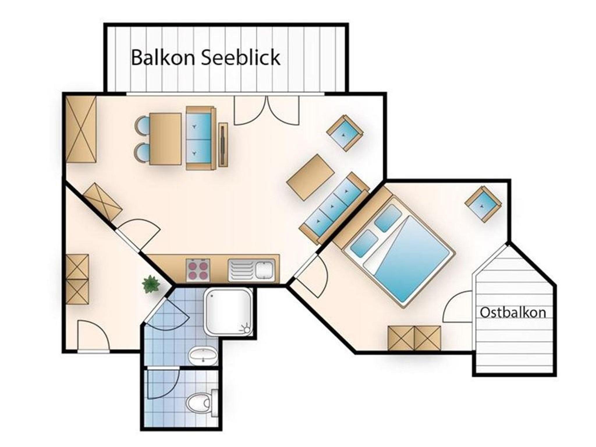 Die Wohnung Seeblick für 2 Personen ist 50 m² groß und hat zwei Balkone. Der Giebel mit dem großen Fenster und Balkon gewährt den freien Blick auf den Großen Alpsee. Der zweite Balkon, nach Osten gerichtet, lädt ein zum Frühstück in der Morgensonne mit dem Blick auf den Grünten. Im gemütlichen Wohnraum steht eine Couch mit Sessel, Sat TV , Safe, Stereorecorder und einen kostenlosen Internetzugang (WLAN), eine Sitzgruppe mit Blick auf den Großen Alpsee, sowie eine komplett eingerichtete Küchenzeile mit Mikrowelle, Spülmaschine, 4-Plattenherd, Backofen, Kühlschrank mit ***Gefrierfach, Toaster, Wasserkocher und Kaffeemaschine, Geschirr, Töpfe und Besteck etc.