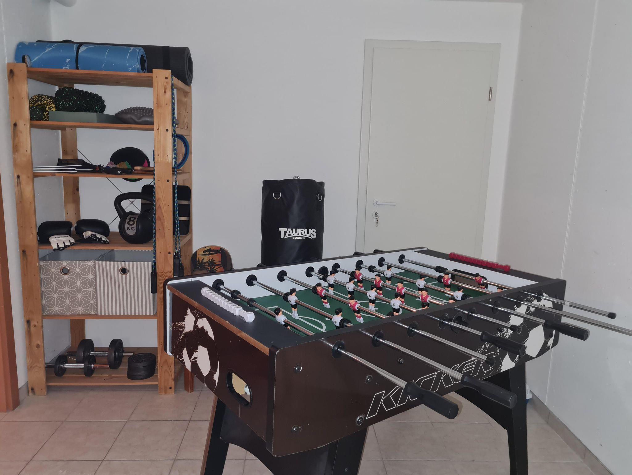 Zur Unterkunft gehören eine sonnige Terrasse mit Grill und Feuerschale sowie ein eigener Parkplatz direkt vor dem Haus. Im Untergeschoss stehen ein gut ausgestatteter Fitnessraum, ein Kicker und Spielmöglichkeiten für Kinder zur Verfügung. Sportgeräte sowie ein SUP können gerne genutzt werden.