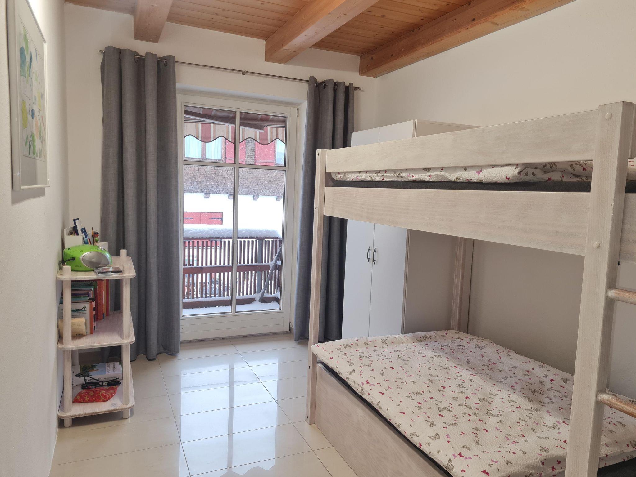Im Obergeschoss befinden sich drei gemütliche Schlafzimmer: ein helles Doppelzimmer, ein weiteres Zimmer mit französischem Bett sowie ein Kinderzimmer mit Hochbett und Balkon. Ein Badezimmer mit Badewanne rundet diese Etage ab.