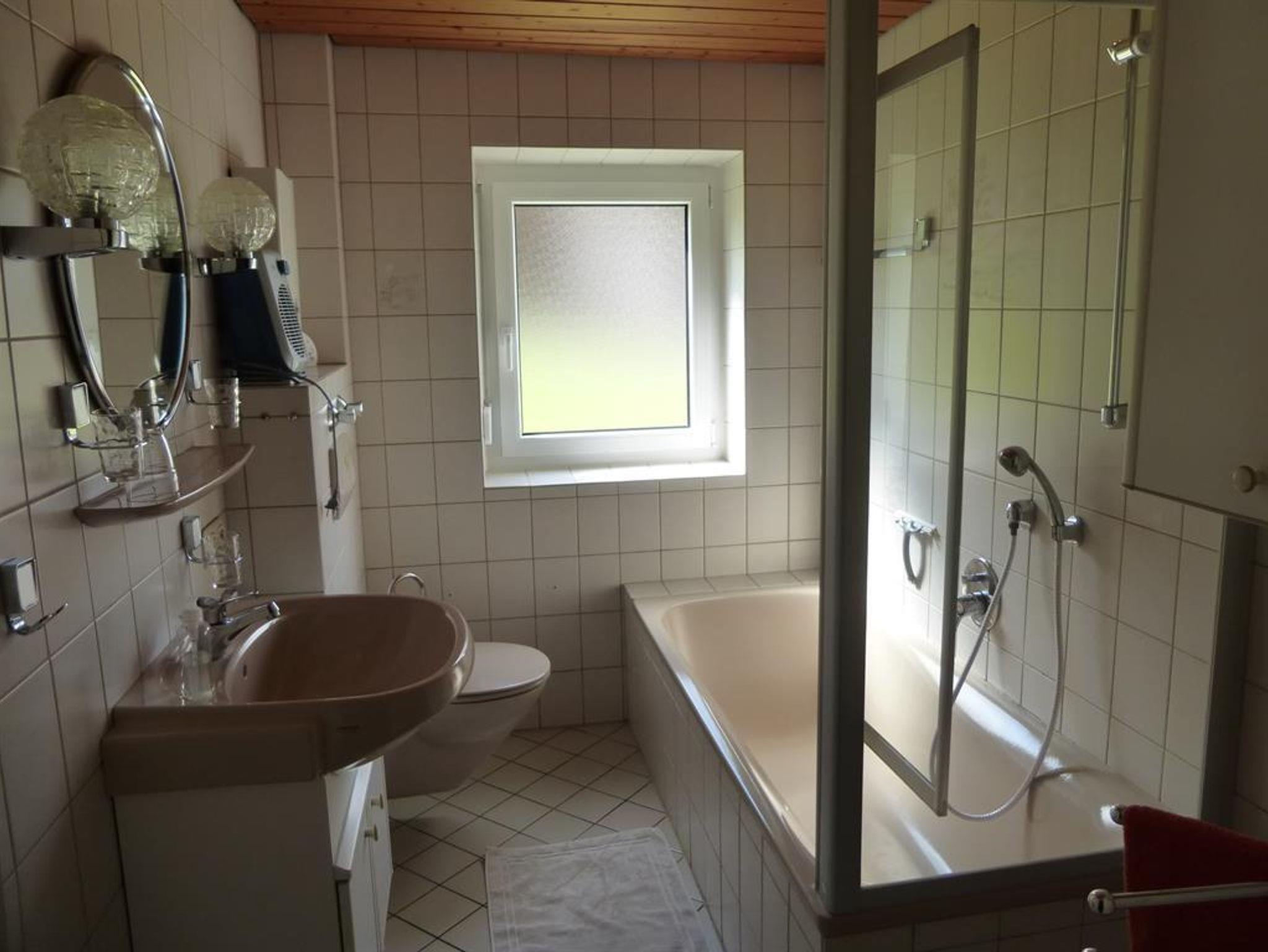 - Badezimmer mit Dusche in der Badewanne, Waschbecken mit Spiegel, WC, Fenster,