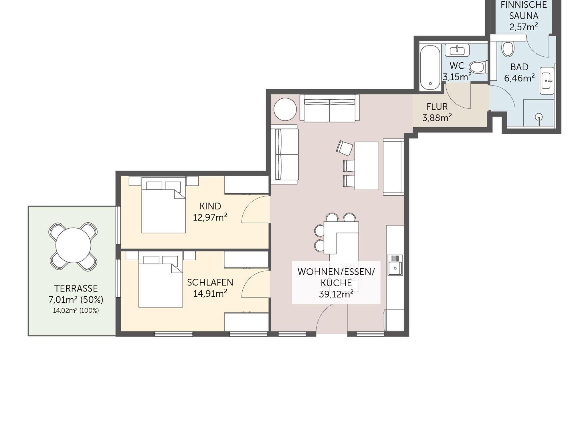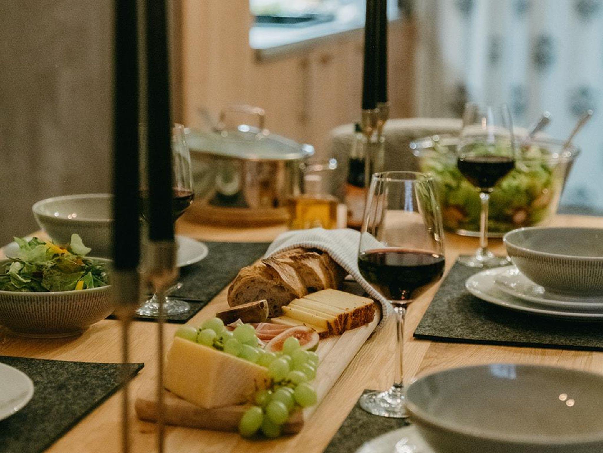 Der großzügige Wohn- und Essbereich ist mit einer Eventküche, einem 65 Zoll TV und einer Musikbox ausgestattet. Hier können Sie gemeinsam kochen, essen und entspannen. Die beiden Badezimmer bieten Ihnen die Wahl zwischen einer entspannenden Whirlpoolbadewanne oder einer großen Regendusche sowie einer finnischen Sauna.