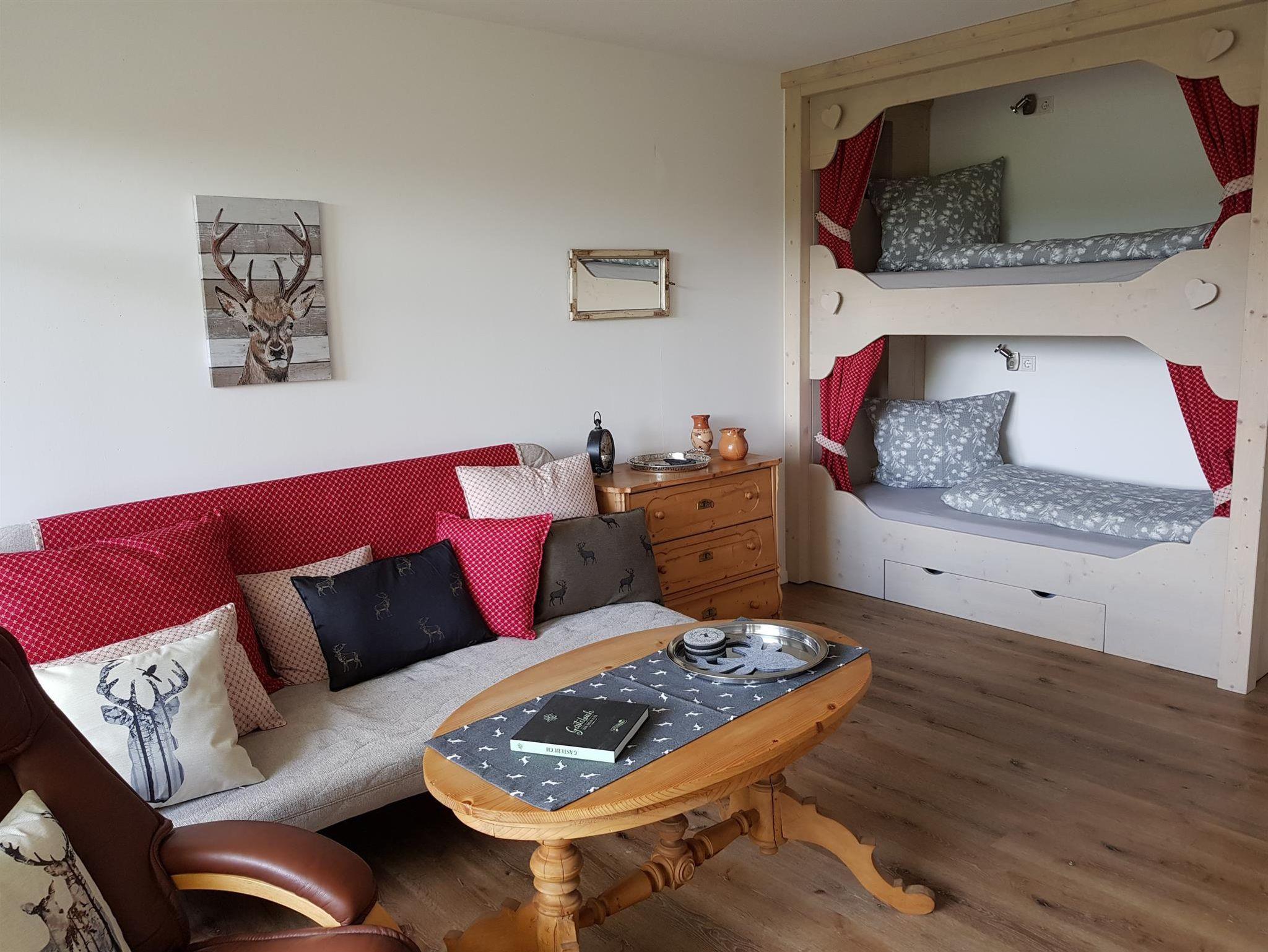 Im Wohnzimmer wurden 2 Alkoven-Betten (0.90/2.00 m) stilvoll integriert Diese sind jedes für sich durch Vorhänge zu verdunkeln. Haben je eine Wandleuchte, eine Ablage und eine eigene Steckdose zum Handy laden.