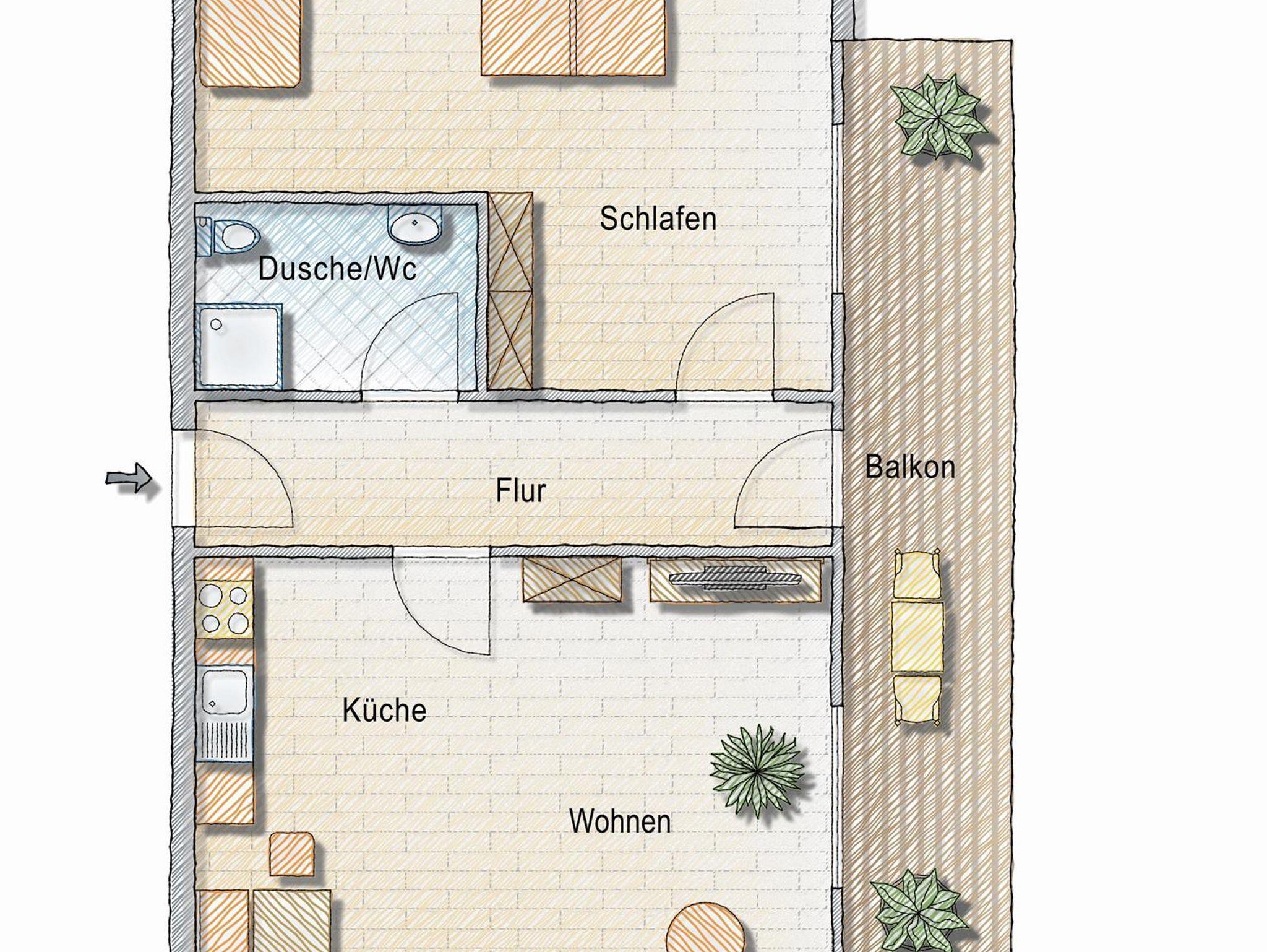 Diese Ferienwohnung ist nach Osten ausgerichtet und bietet ein Schlafzimmer ( 3 Betten ), eine Wohnküche mit Spülmaschine, Backofen, Mikrowelle, TV und zwei Schlafmöglichkeiten, Du/Wc und einen Balkon.