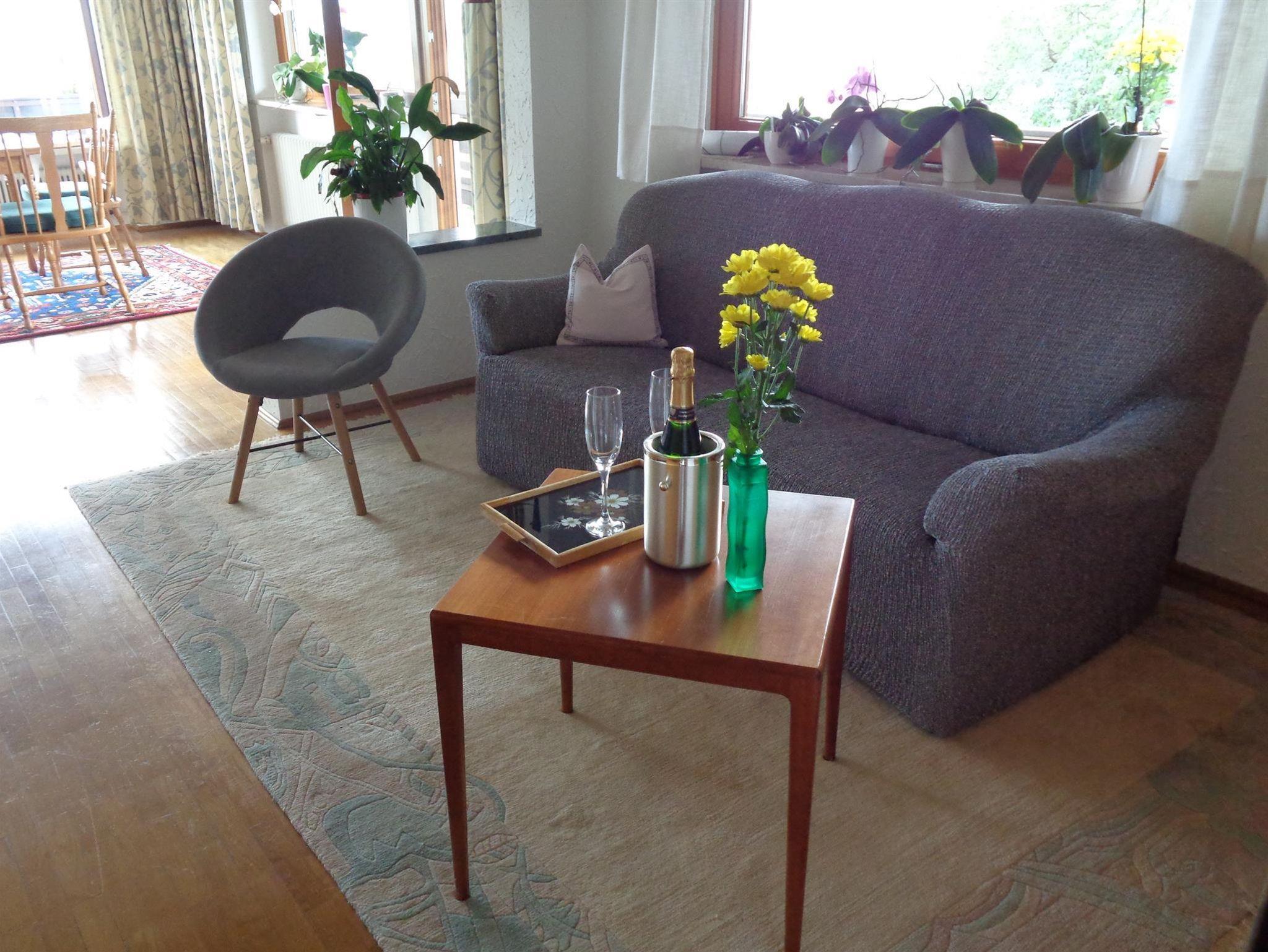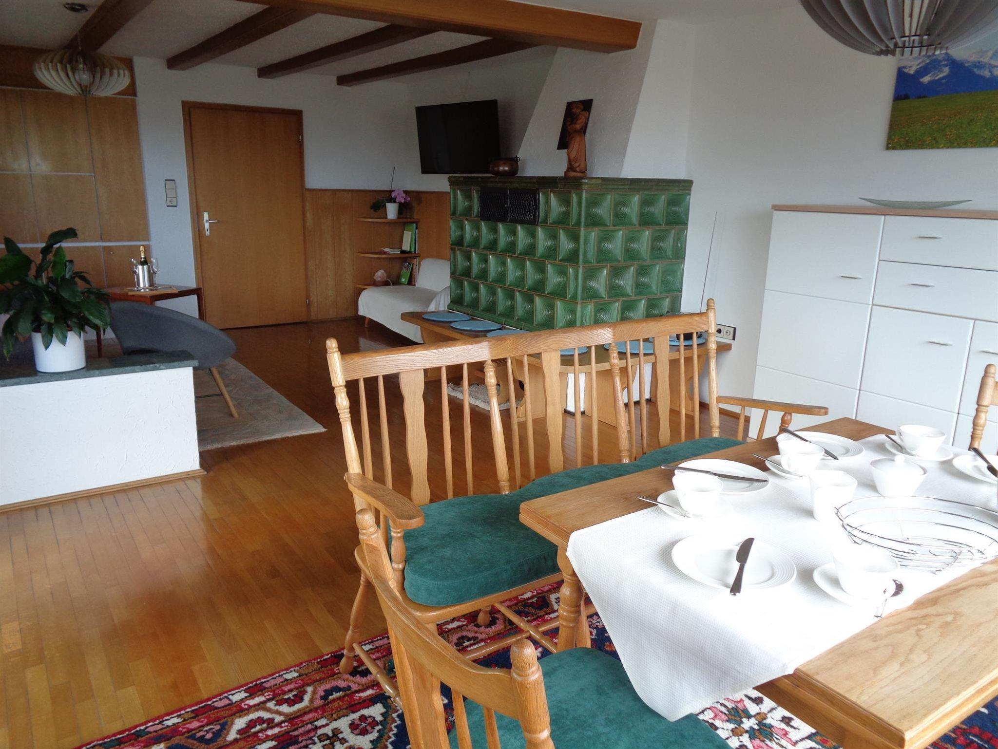Die Wohnung verfügt über zwei Schlafzimmer, eines mit einem Doppelbett und im zweiten Zimmer stehen zwei Einzelbetten, beide Schlafzimmerfenster sind mit Mückengittern ausgestattet. Das große geräumige Wohnzimmer hat einen großzügigen Essplatz und einen gemütlich eingerichteten Fernsehbereich. Ein Kachelofen, welcher im Winter nach Rücksprache beheizt werden kann, gibt dem Raum ein gemütliches Ambiente. Brennholz ist jedoch im Preis nicht enthalten.