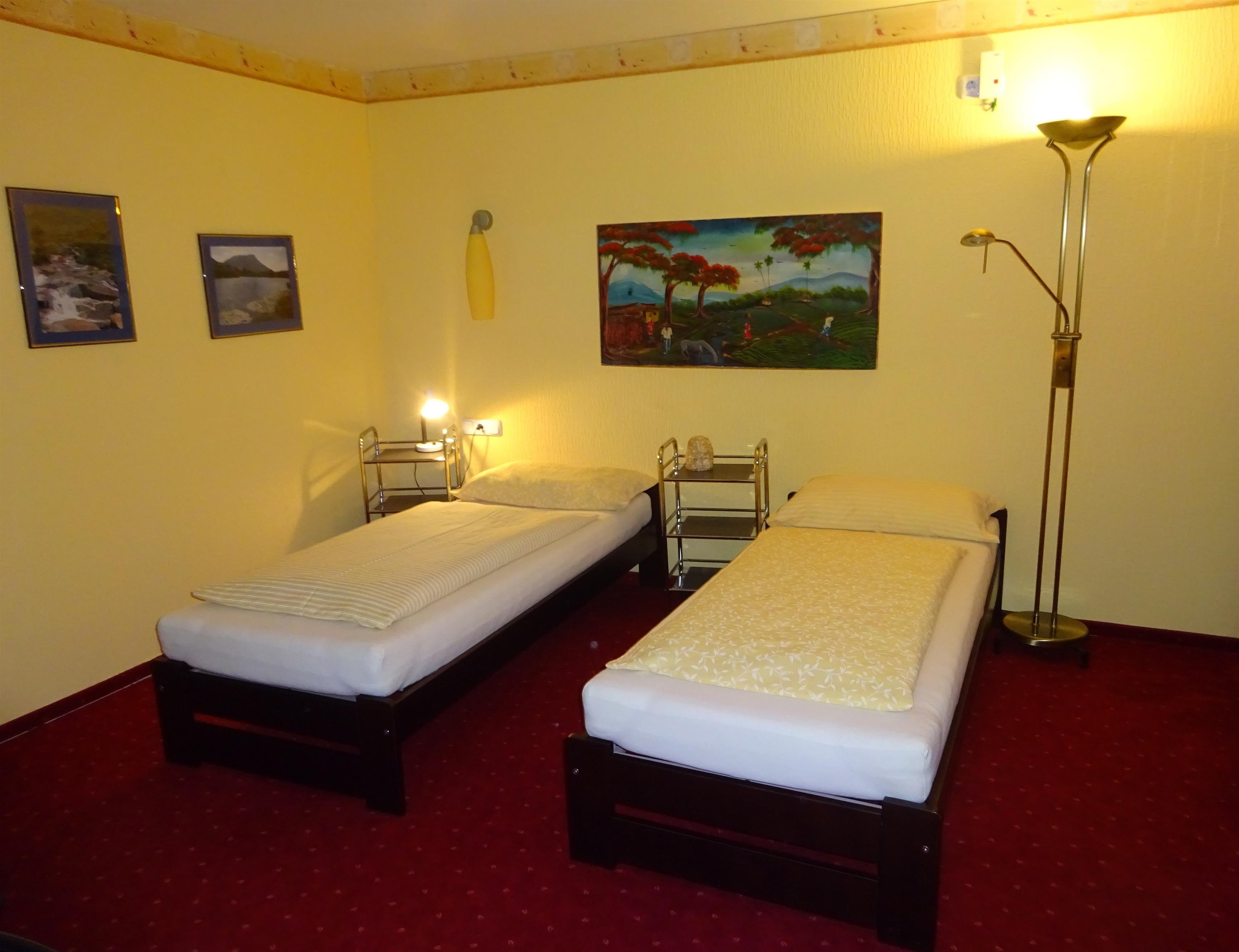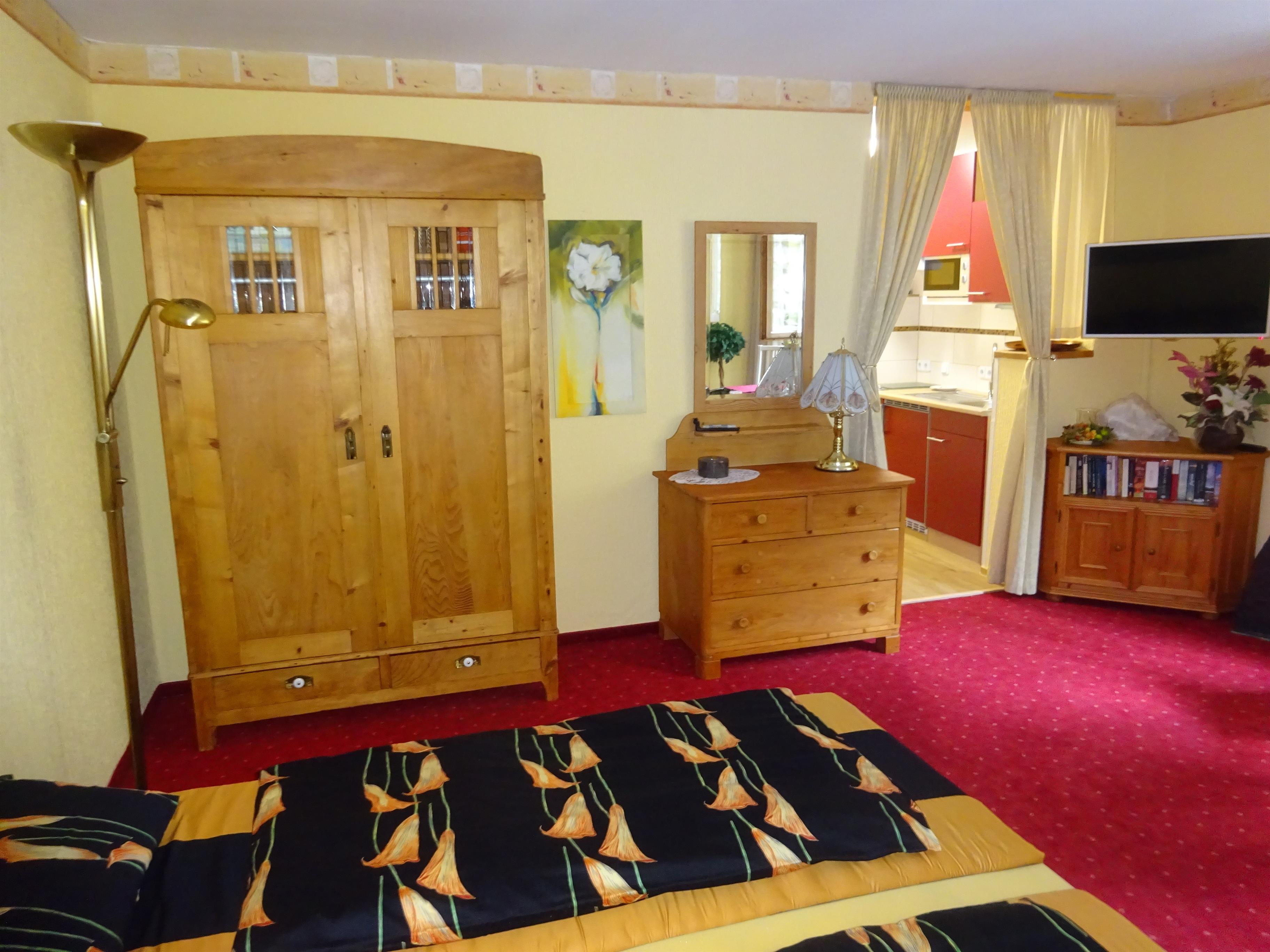 Zwei Betten die auch getrennt stehen können. Großer Kleiderschrank mit Bügeln, Schubladenschrank mit Spiegel,