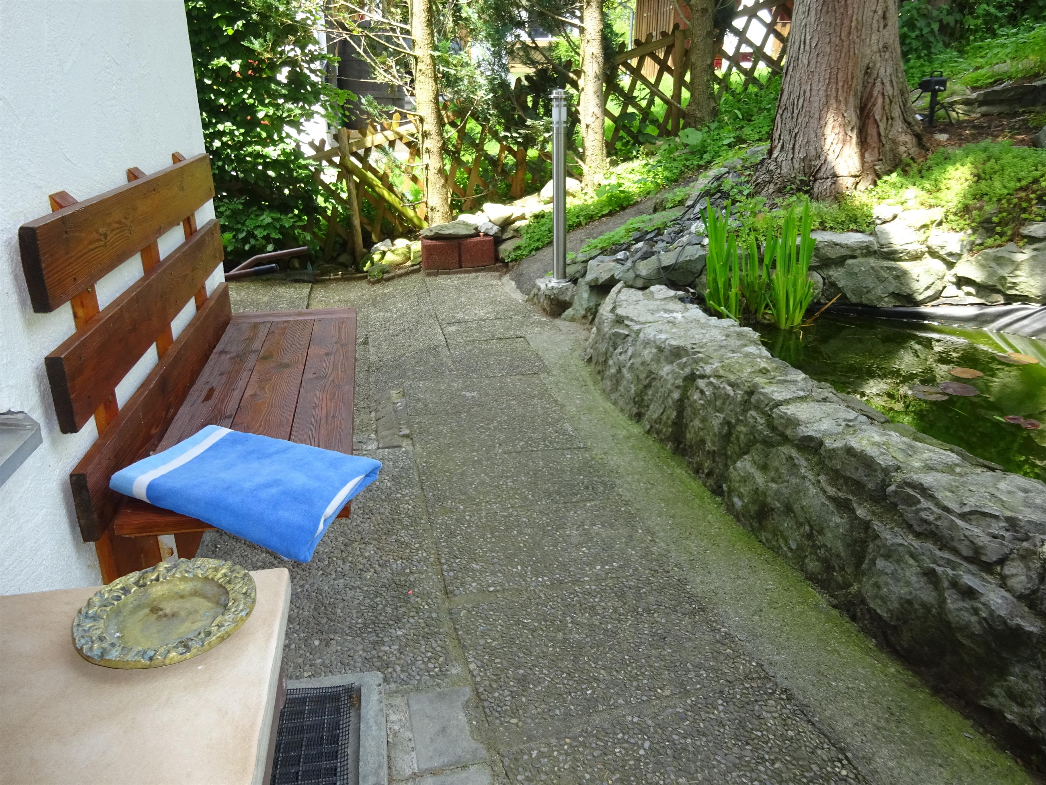 An heißen Tagen lädt die Bank am Teich zum Verweilen ein.