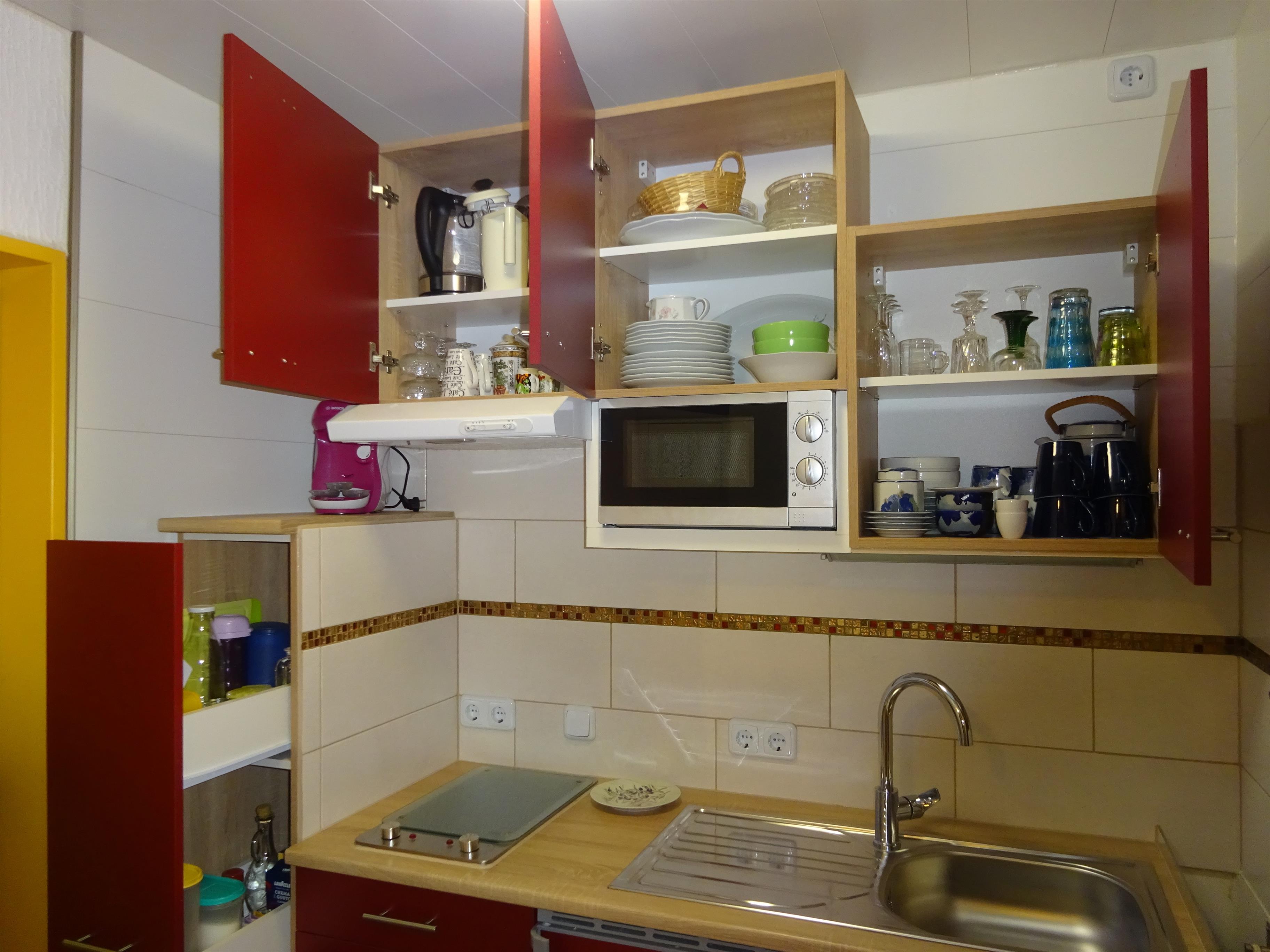 Großer Esstisch, eine sehr gut ausgestattete Küchenzeile.
