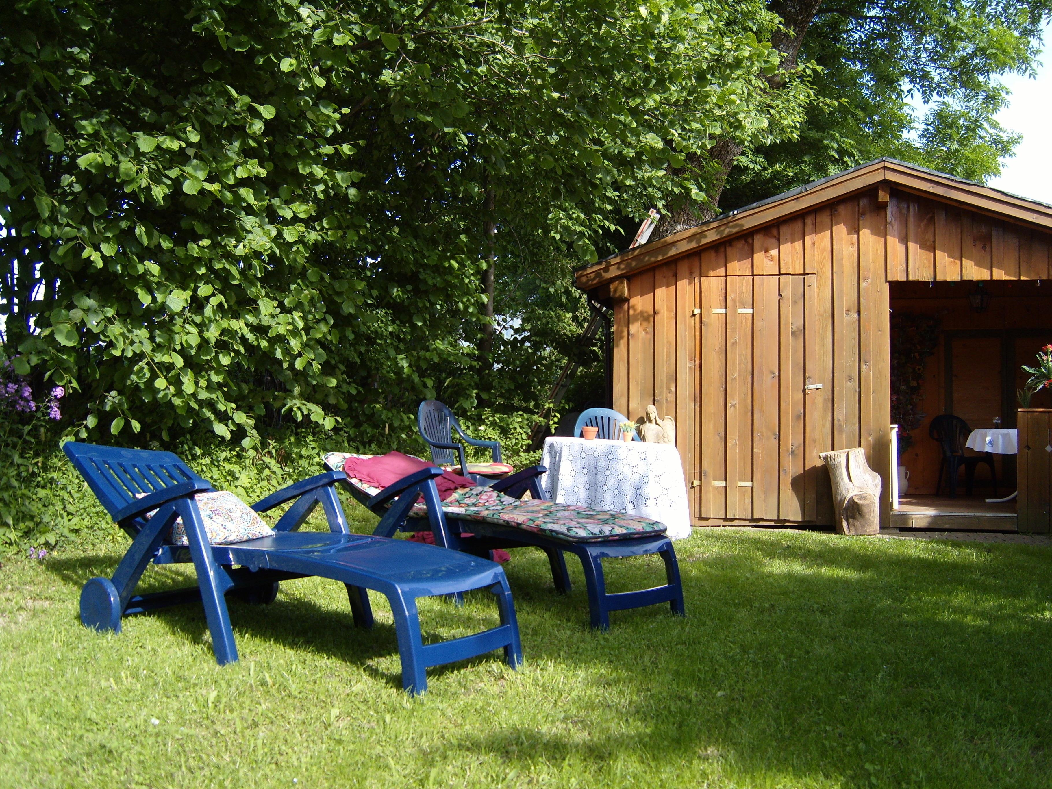 Auf der Liegewiese am Gartenhaus (zur mit Benutzung) stehen Liegestühle.