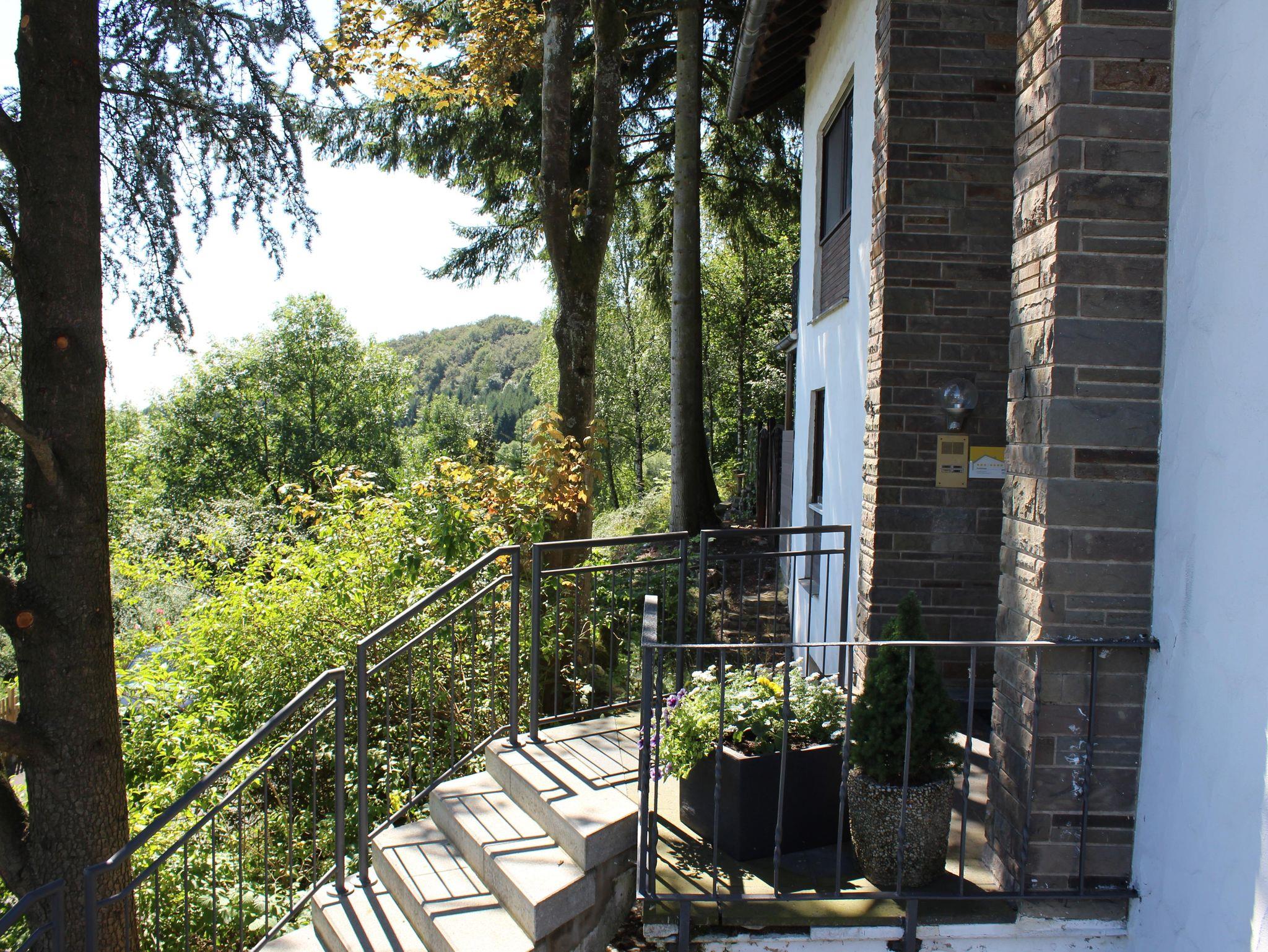 Die vordere große Terrasse (direkt vom Wohn-Essraum zugänglich) steht nur den Gästen der Ferienwohnung EifelNatur 1 zur Verfügung und bietet Ihnen einen Holzkohle-Grill sowie einen großen Tisch mit Stühlen und lädt zum Verweilen und Genießen ein.