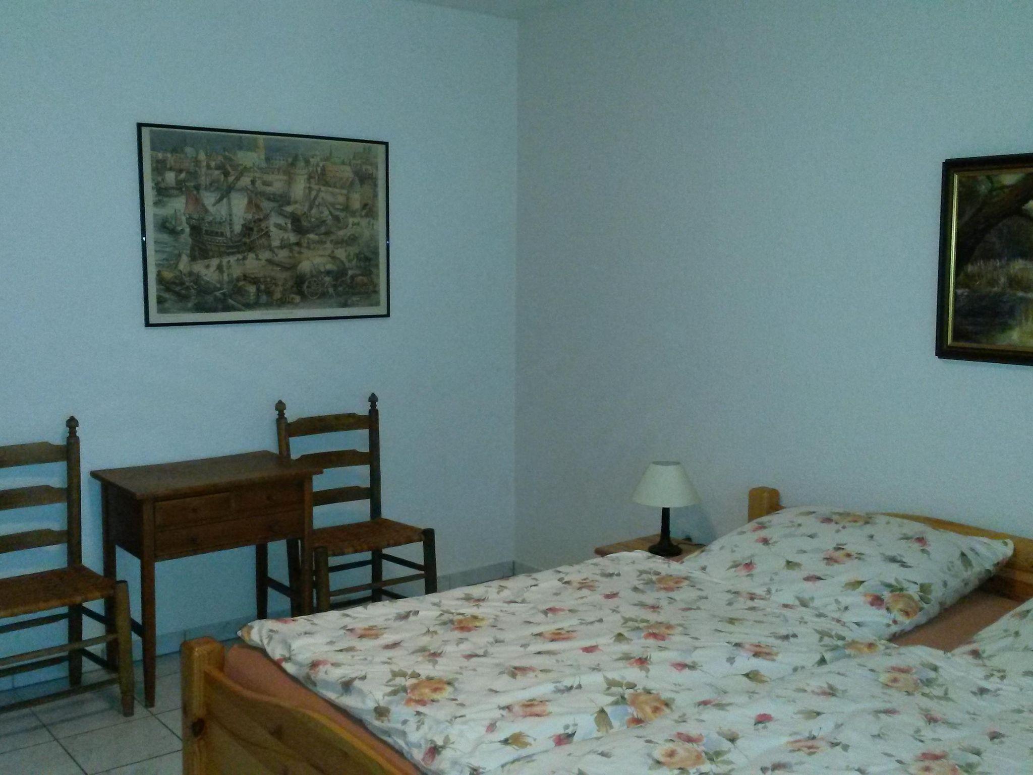 Das Schlafzimmer ist ausgestattet mit einem großen Bett (2 x 2 m) und einem großen geräumigen Kleiderschrank. Ferner sind Nachtschränkchen, Spiegel, ein kleines antikes Tischchen mit zwei Stühlen vorhanden.