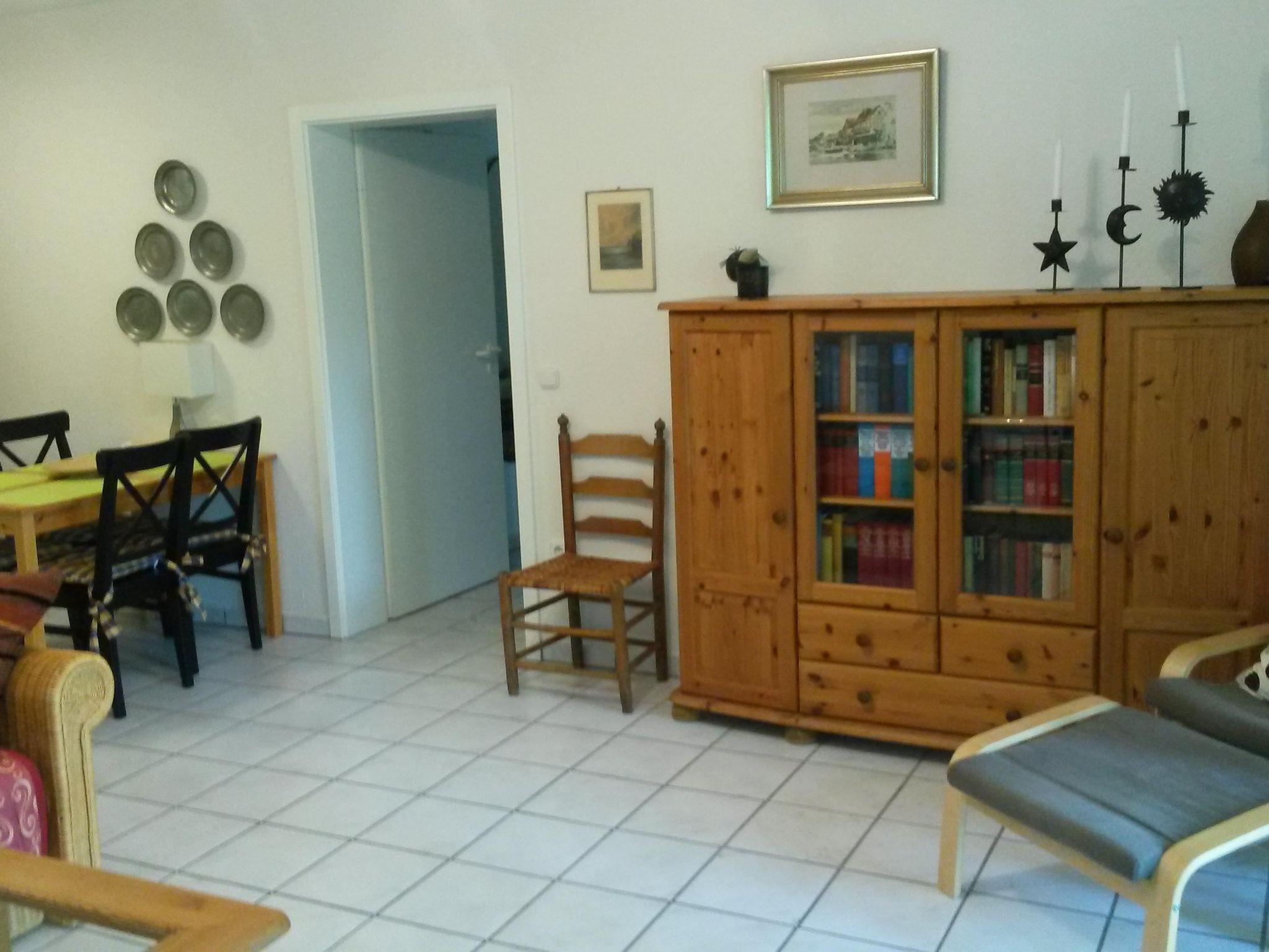 Gemütliches großes Wohnzimmer mit Schlafcouch (2 x 1,40 m), Esstisch und 4 Stühlen, Anrichte, Vitrine, Bücherregalen mit interessanten Büchern, Sessel, Couchtisch, TV mit DVD-Player, Satellitenanlage, Musikanlage.