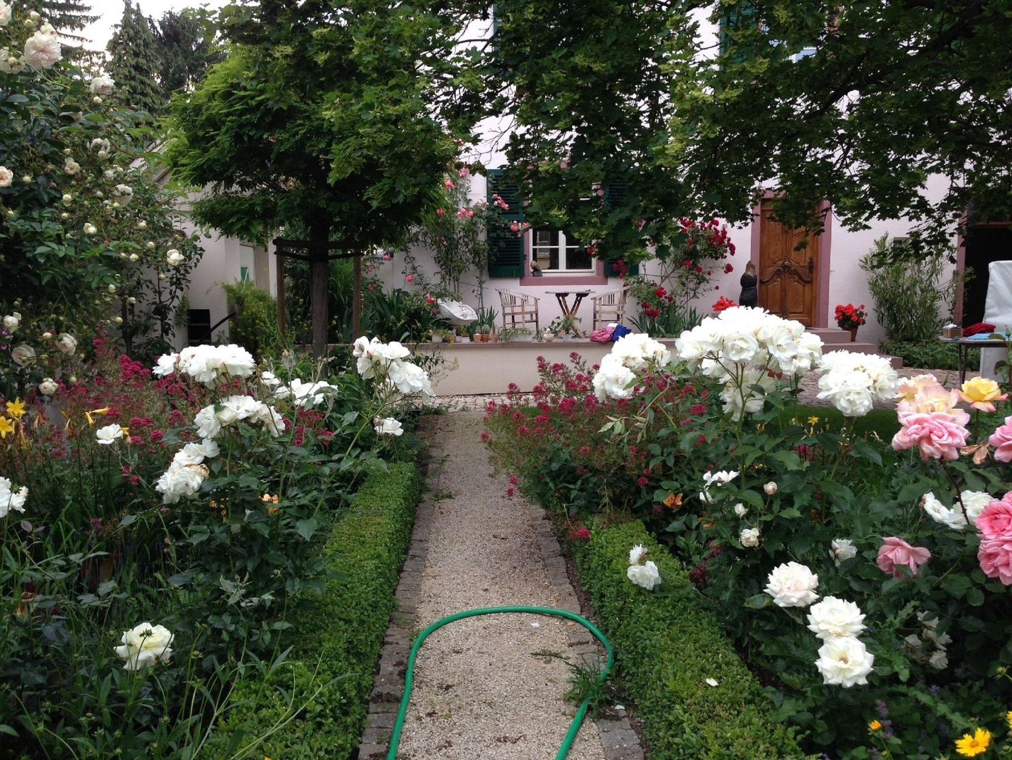 Vom Wohnzimmerfenster aus genießen Sie den herrlichen Blick über Ihre Terrasse in den ruhigen Rosen-Garten.