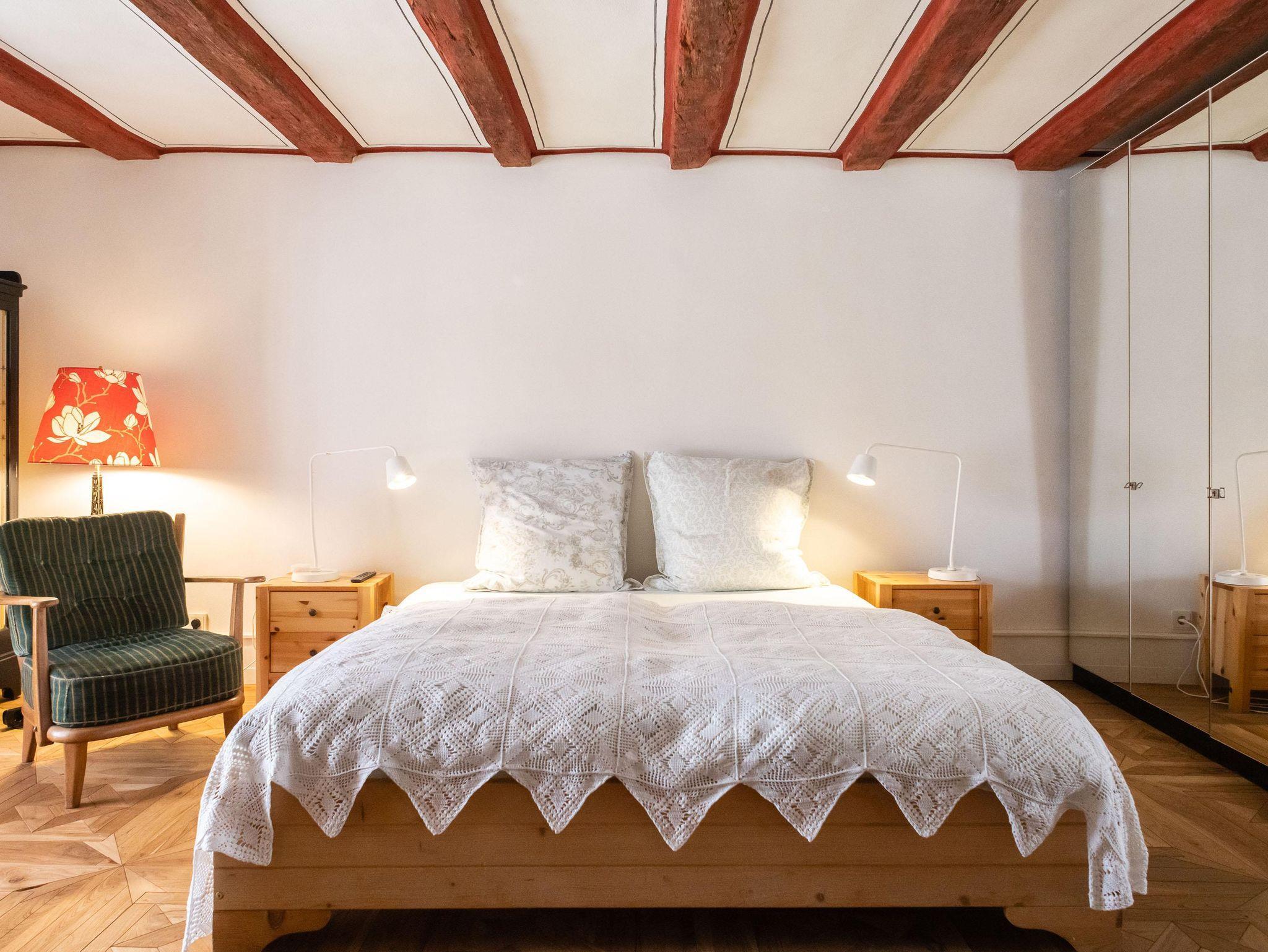 Ihr geräumiges Schlafzimmer ( twin oder Double) erreichen Sie über einige ( innenliegende) Stufen, da es sich im ältesten Teil des Hauses, einem Fachwerkbau befindet.