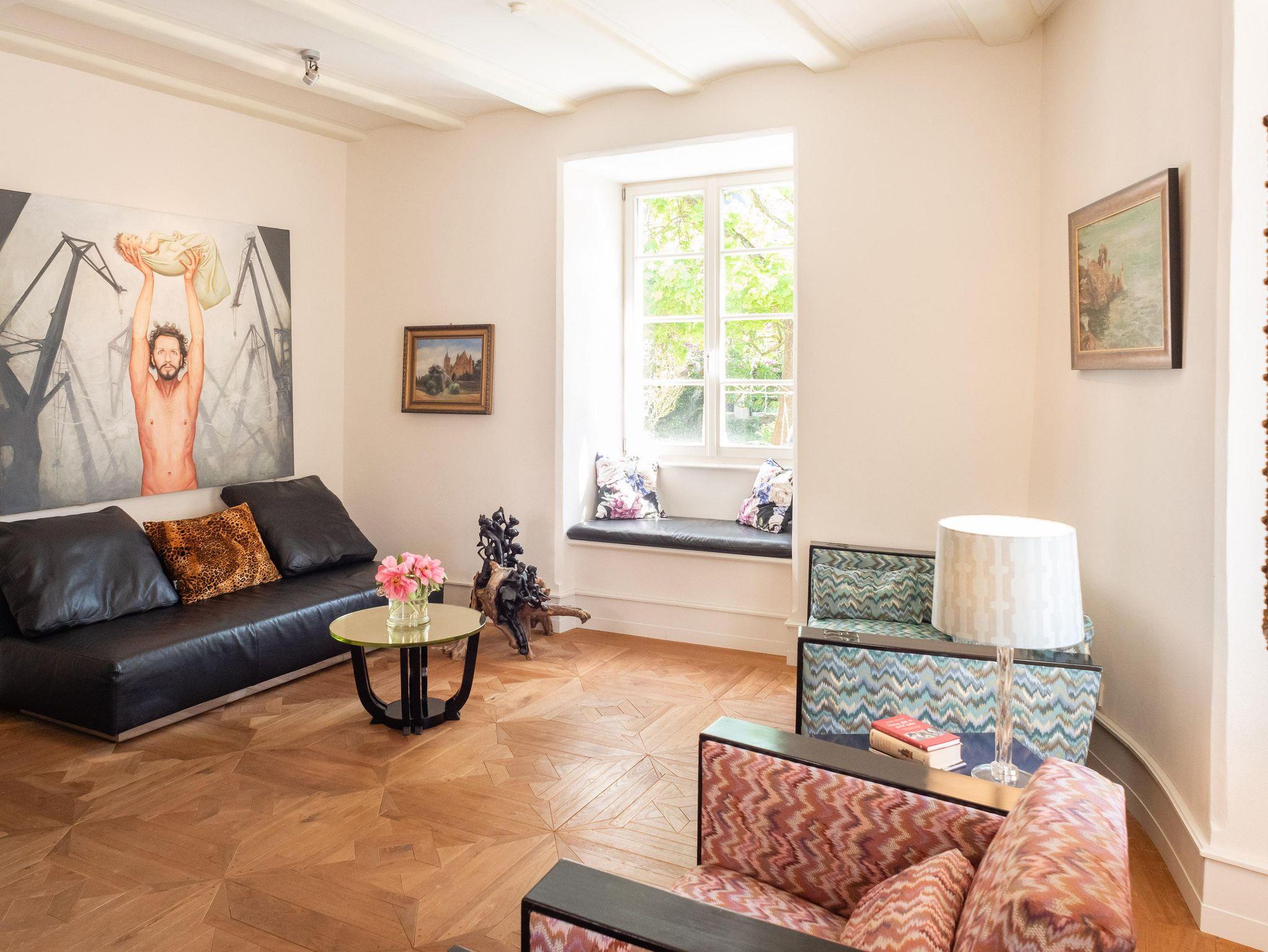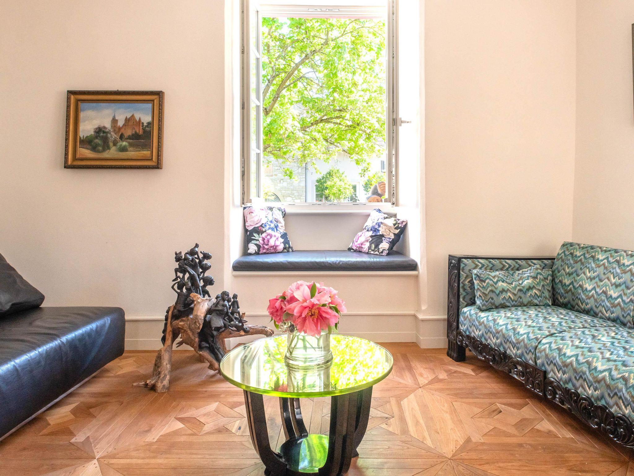 Der Wohnraum, wie auch das Esszimmer sind mit originalen, antiken Art-Dekomöbeln aus Frankreich und Ölgemälden ausgestattet, im Wohnzimmer befindet sich zusätzlich eine Design-Ausziehcouch für einen 3./4.Besucher.