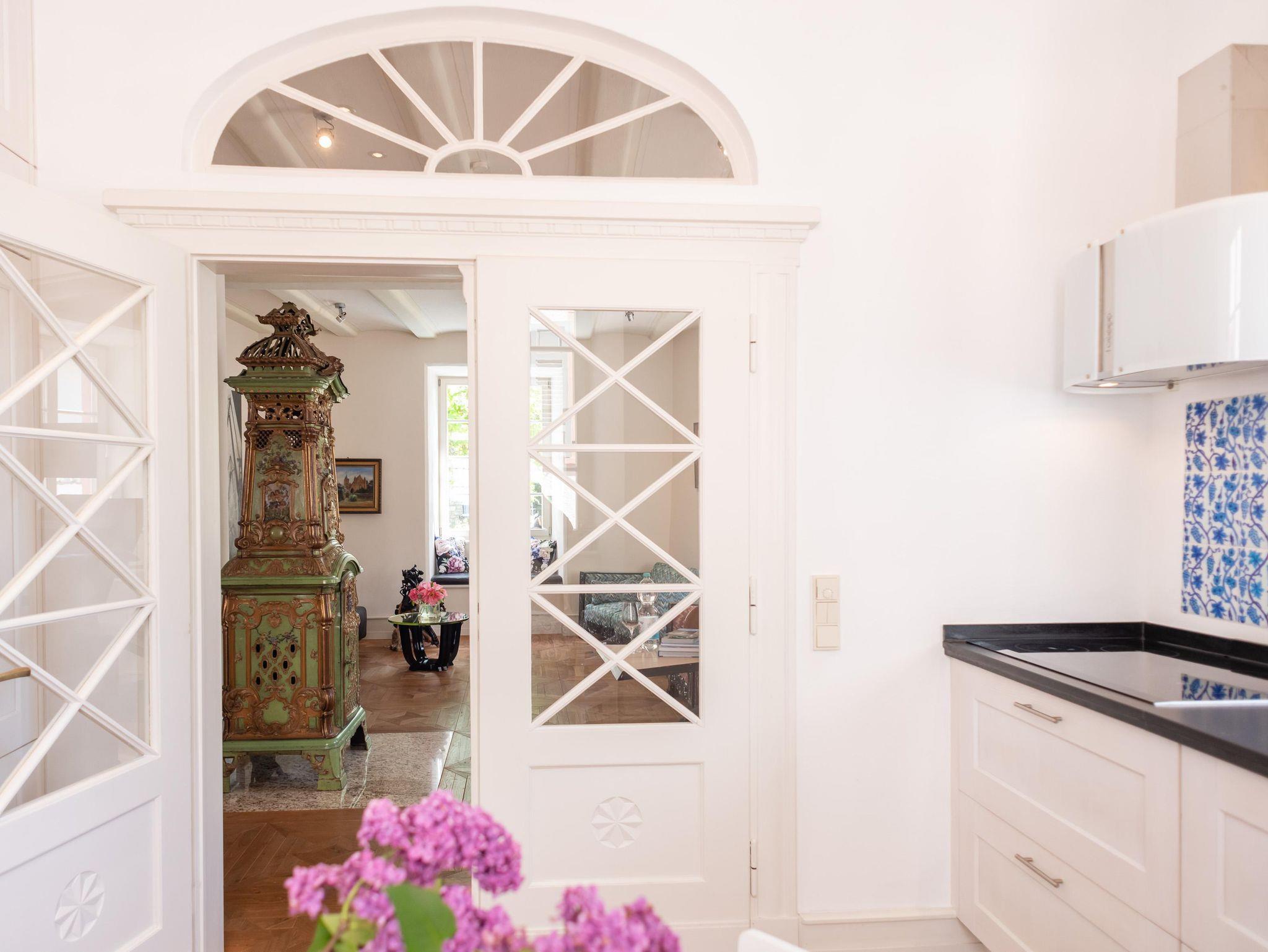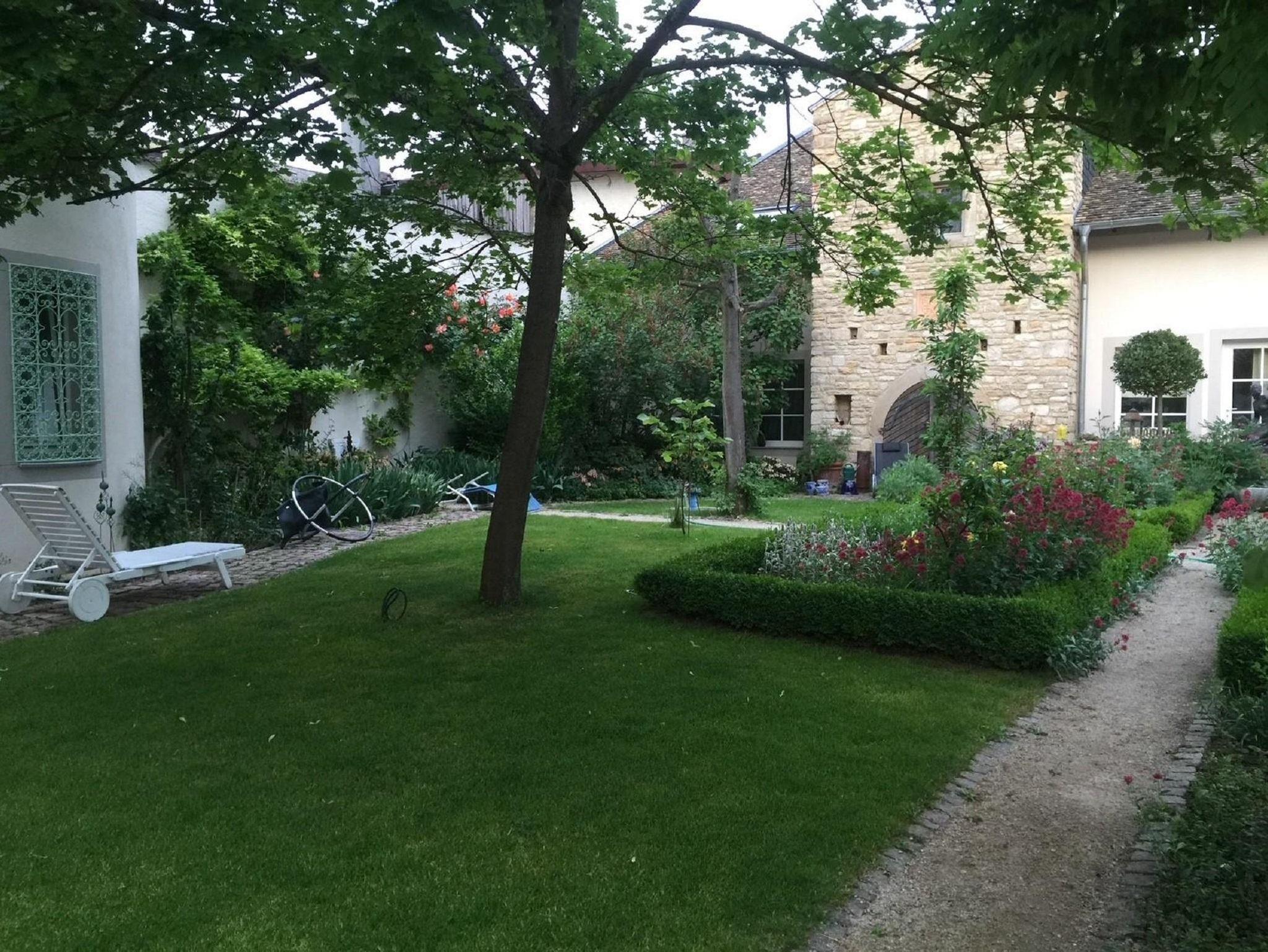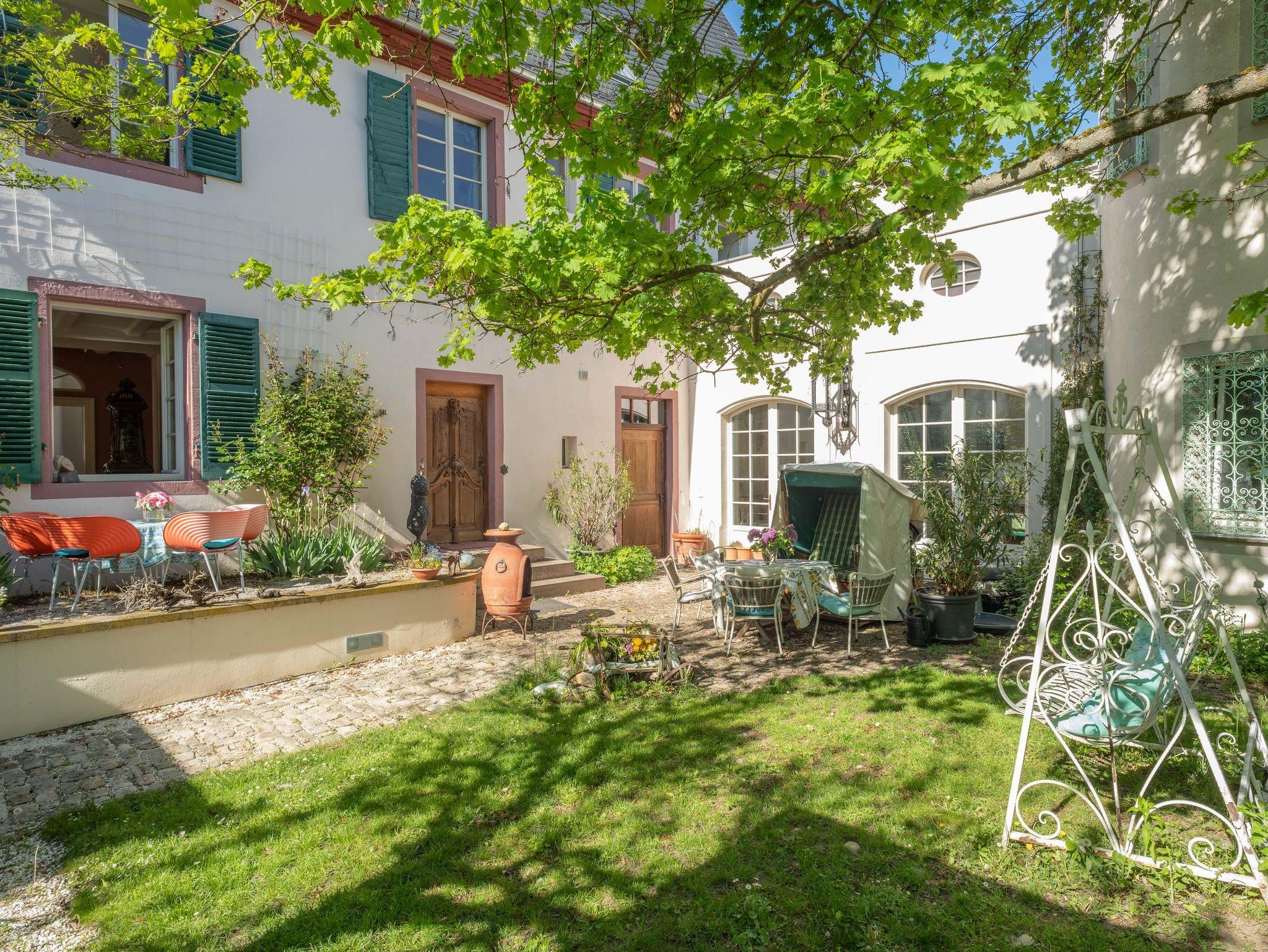 Durch eine kleine Pforte gelangen Sie in den barocken Garten und einen gepflasterten, mediterranen Innenhof. Eine Sandsteintreppe führt zu Ihrer circa 100 m² großen Hochparterre-Wohnung. Hochwertigste Teakholz Kassetten-Böden, Lehmwände, Buntglasfenster, geschnitzte Handläufe und Türen mit antiken Beschlägen sowie hohe, helle Balkendecken geben der Wohnung ihr unverwechselbares Ambiente.