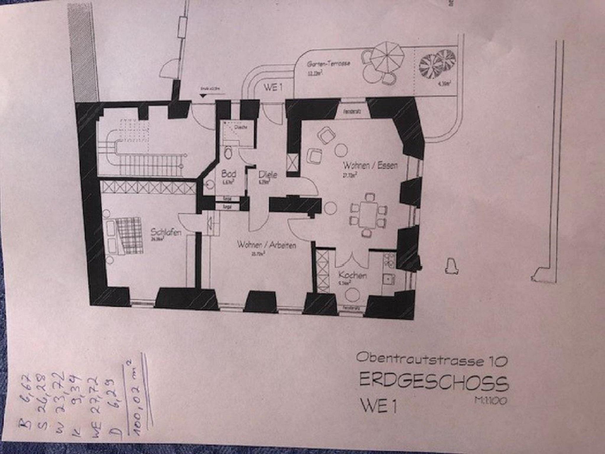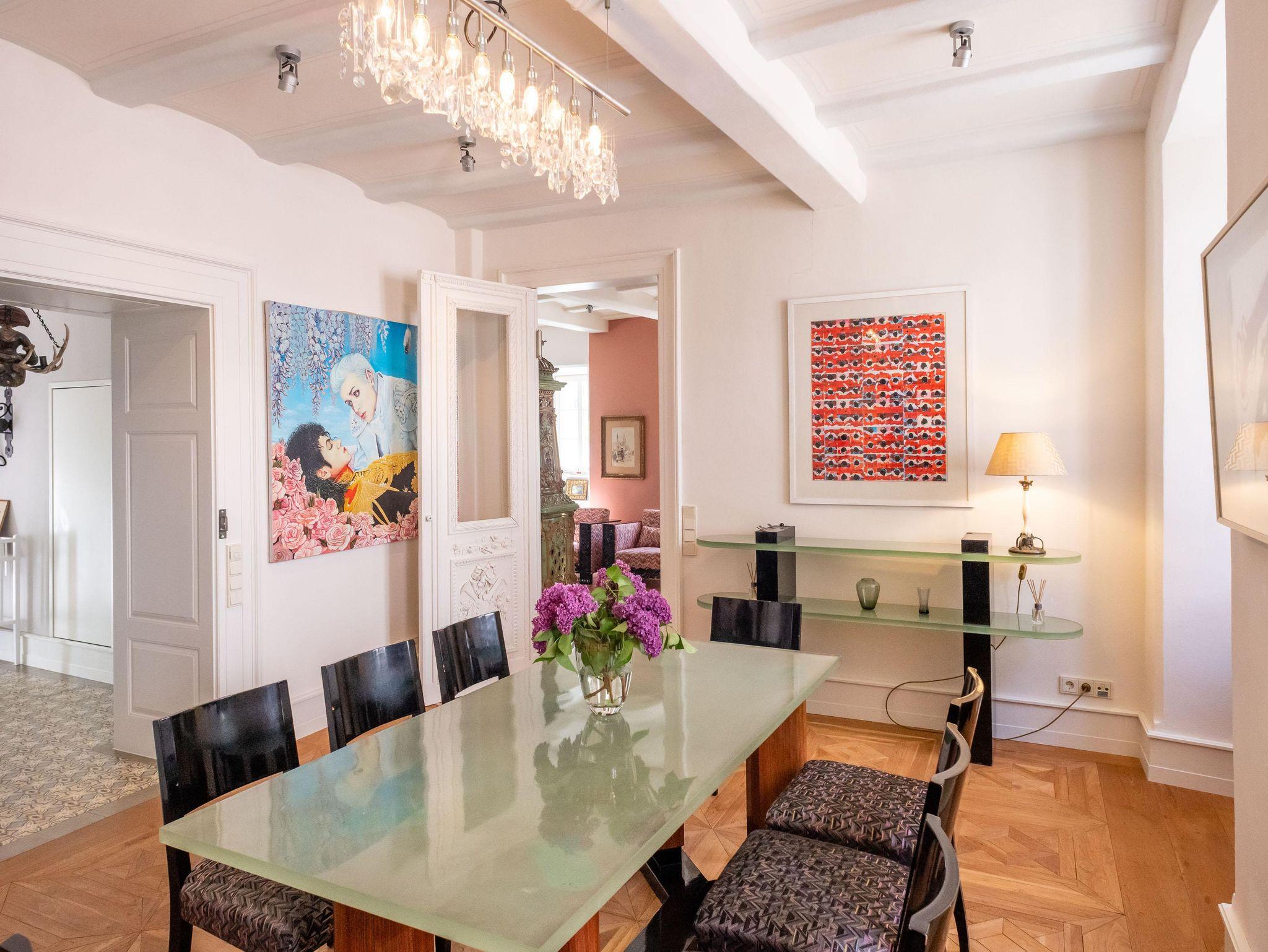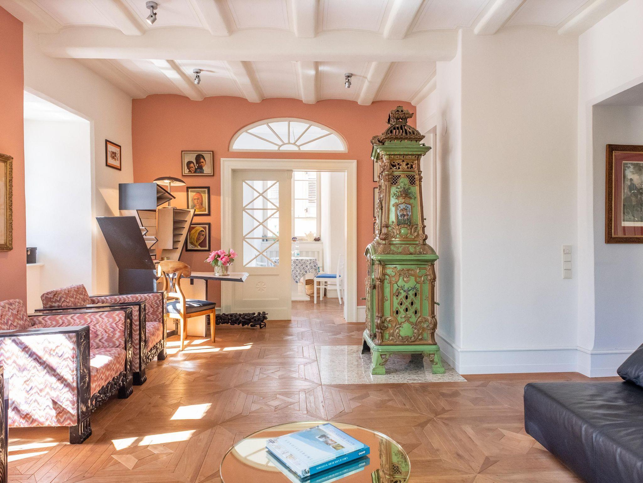 Durch eine kleine Pforte gelangen Sie in den barocken Garten und einen gepflasterten, mediterranen Innenhof. Eine Sandsteintreppe führt zu Ihrer circa 100 m² großen Hochparterre-Wohnung. Hochwertigste Teakholz Kassetten-Böden, Lehmwände, Buntglasfenster, geschnitzte Handläufe und Türen mit antiken Beschlägen sowie hohe, helle Balkendecken geben der Wohnung ihr unverwechselbares Ambiente.