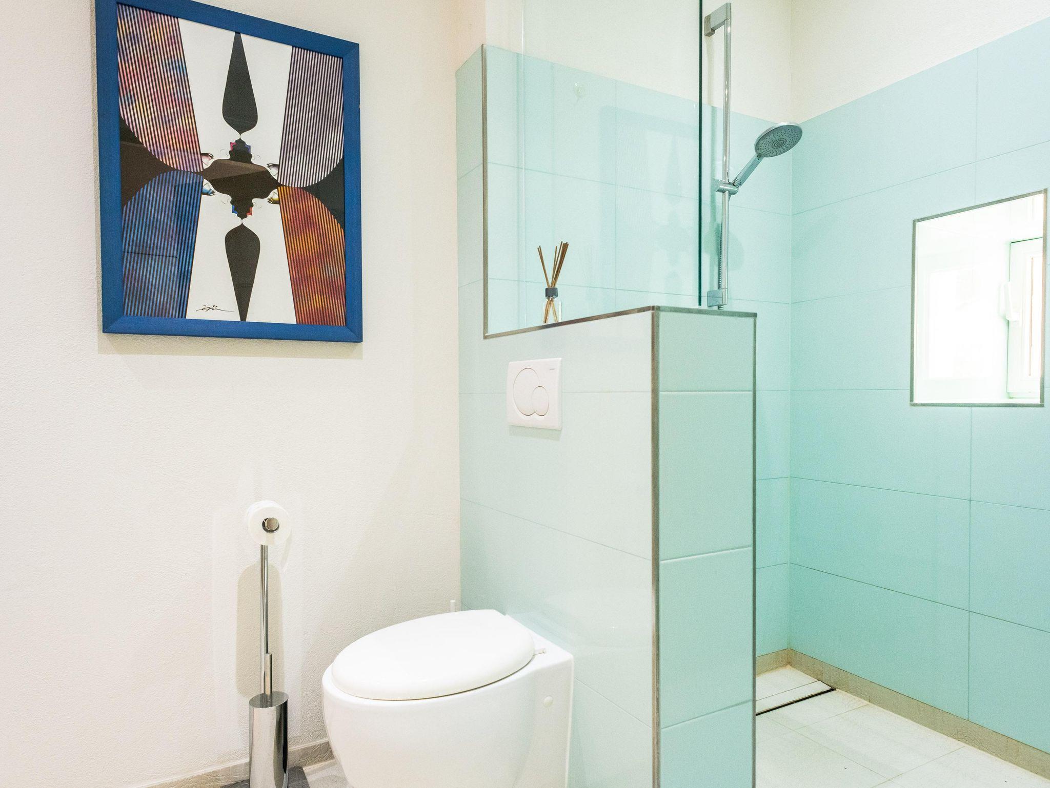 Das wohnliche, türkisfarbene Duschbad mit Fußbodenheizung, bodengleicher Dusche und einem in ein altes Sandsteinportal integriertes Glas-Regal wird Ihnen gefallen.