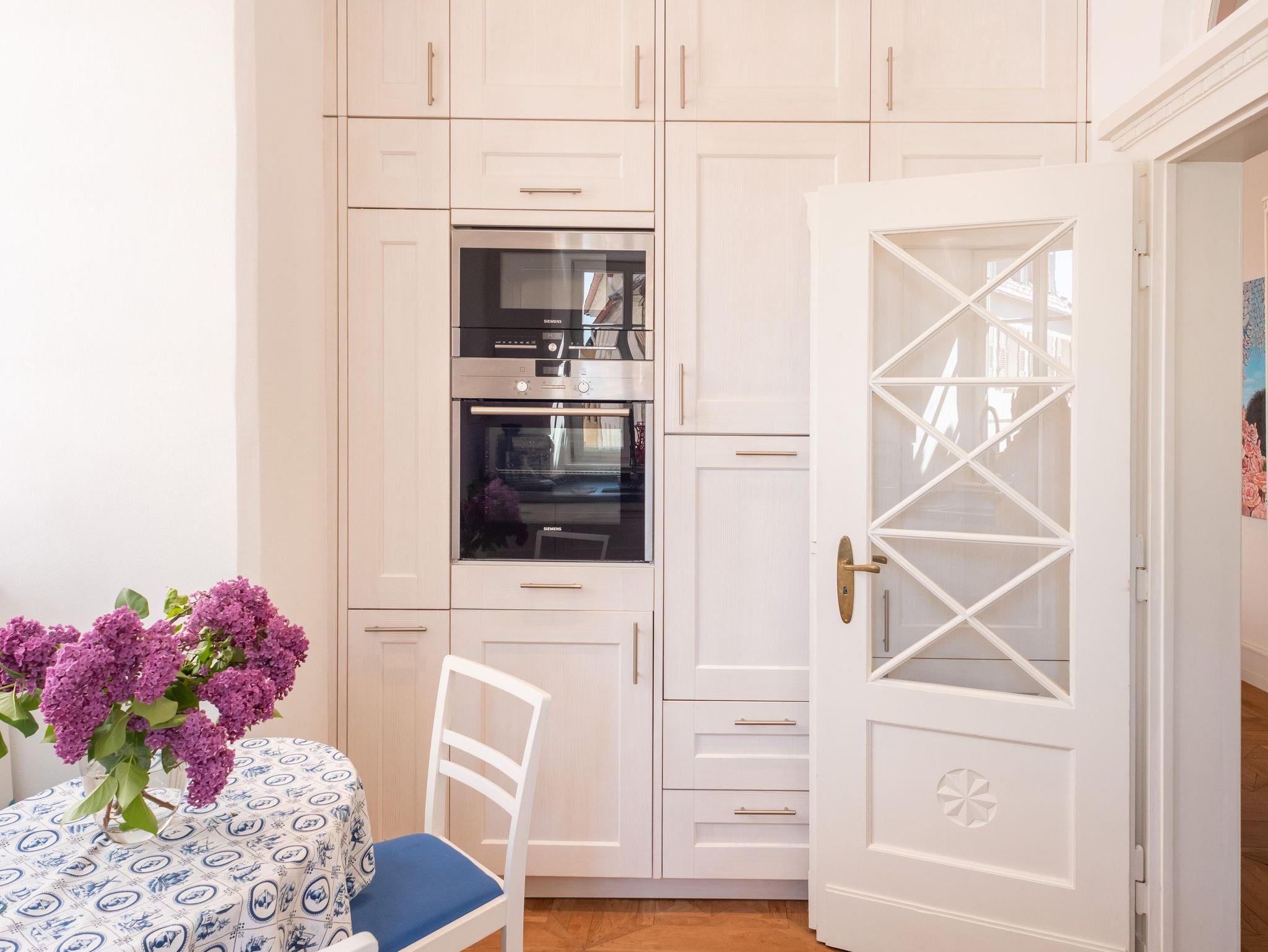 Die voll ausgestattete, weiße Massivholzküche (Espressomaschine, Geschirrspüler, Mikrowelle, Herd, Dunstabzug, Waschmaschine, Trockner) verfügt in einer tiefen Mauernische über einen netten Frühstücksplatz. Von dort schauen Sie die gepflasterte Straße entlang bis zum Schloss Westerhaus, Weingut von Opel, über dem Selztal.