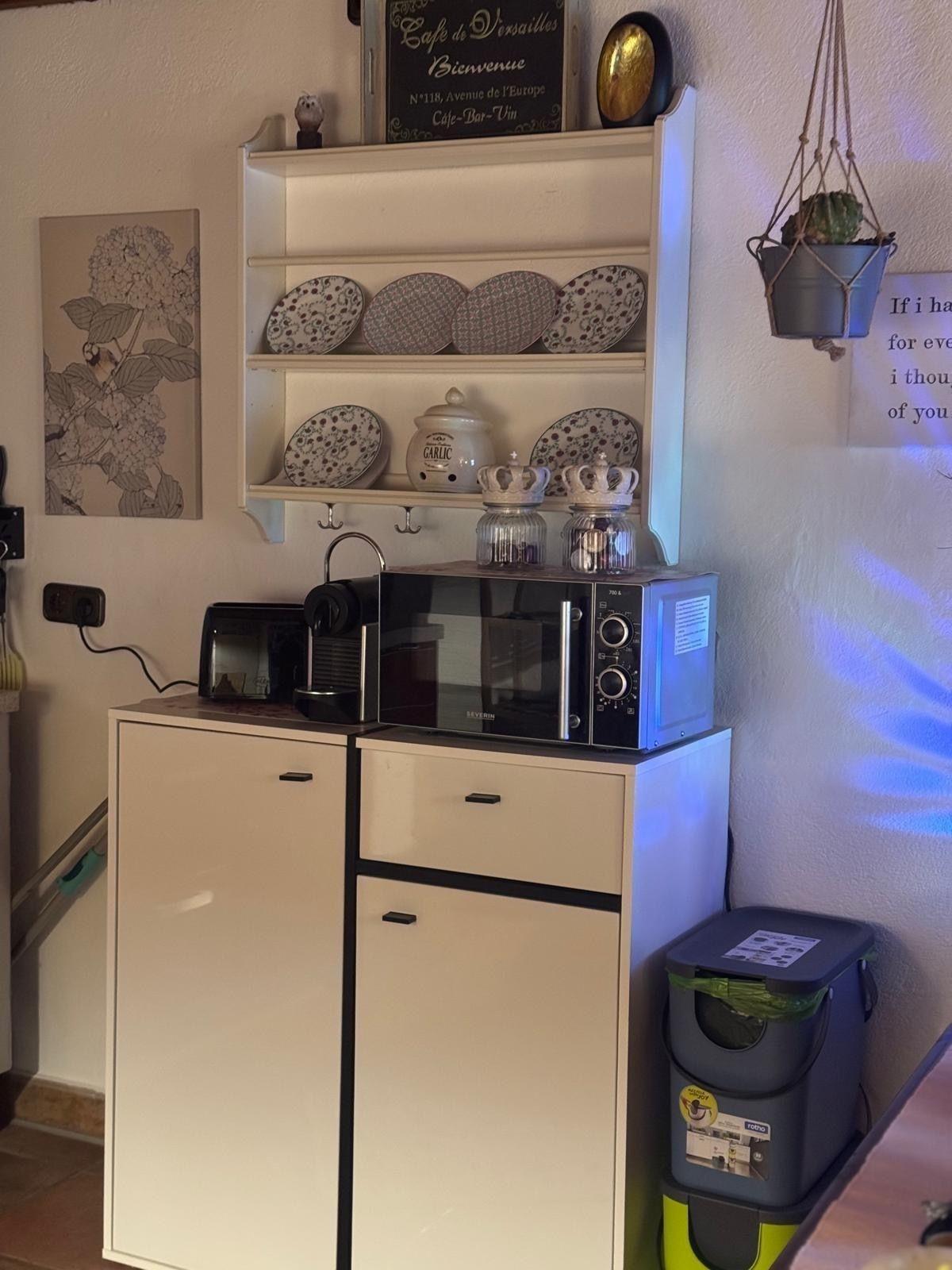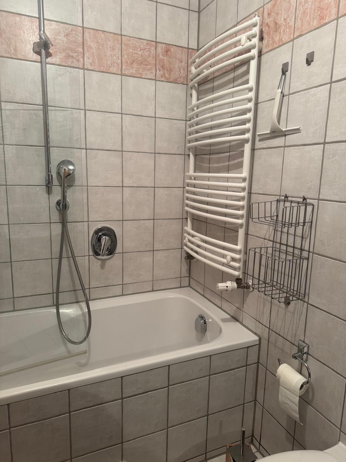 Es gibt ein Wohnzimmer und ein separates Schlafzimmer und eine kleine Küche so wie eine Waschmaschine/Wäschestander, Bügeleisen.
