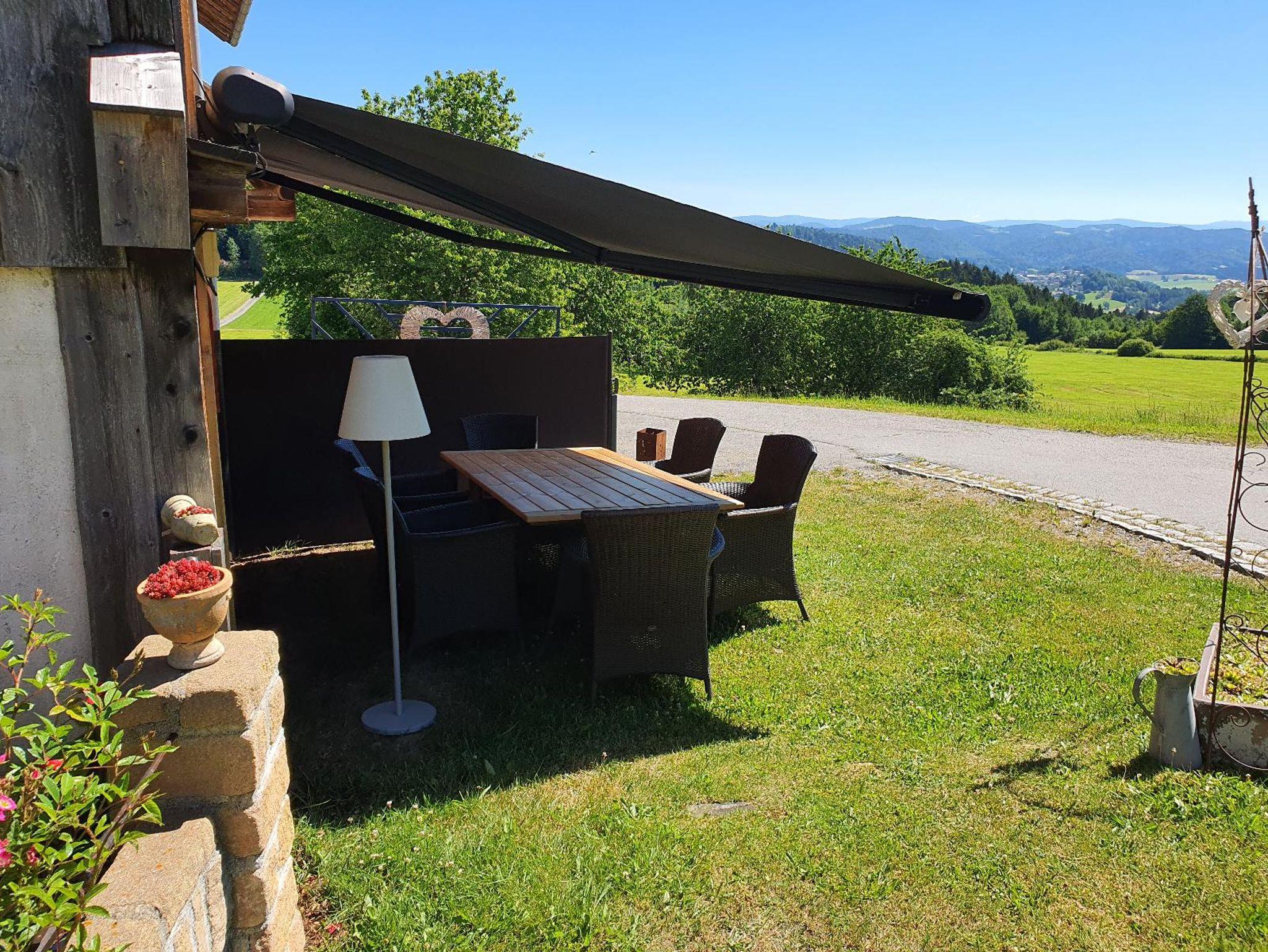 ein Sitzplatz im Freien mit beleuchteter Markise, Windschutz und einem Weber Grill, mit herrlichem Blick auf den Rachel und Dreisessel bis ins Mühltal nach Österreich hinein.